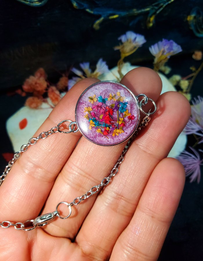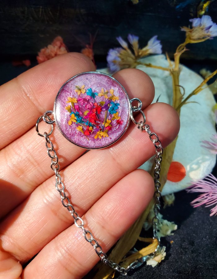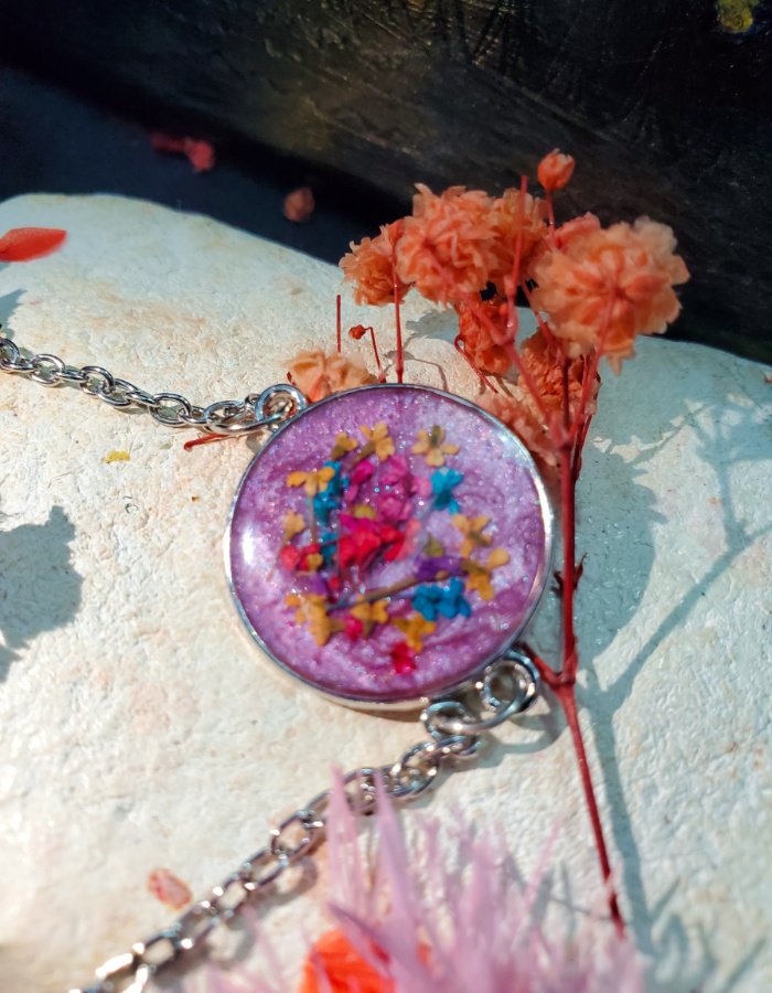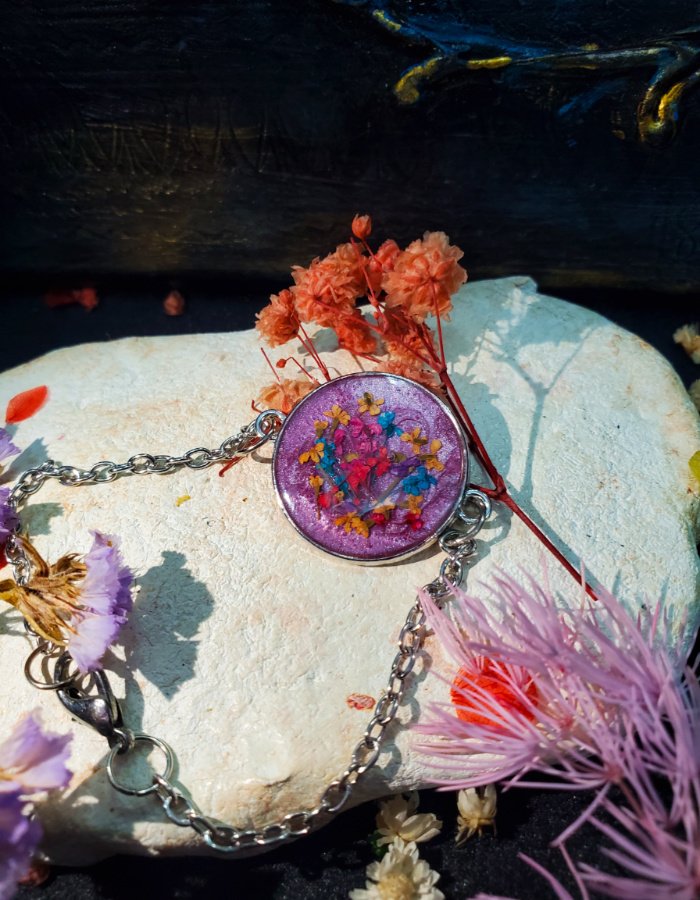 - Preserved multicolor blossoms in purple resin — glowing with majesty, vibrancy, and grace.