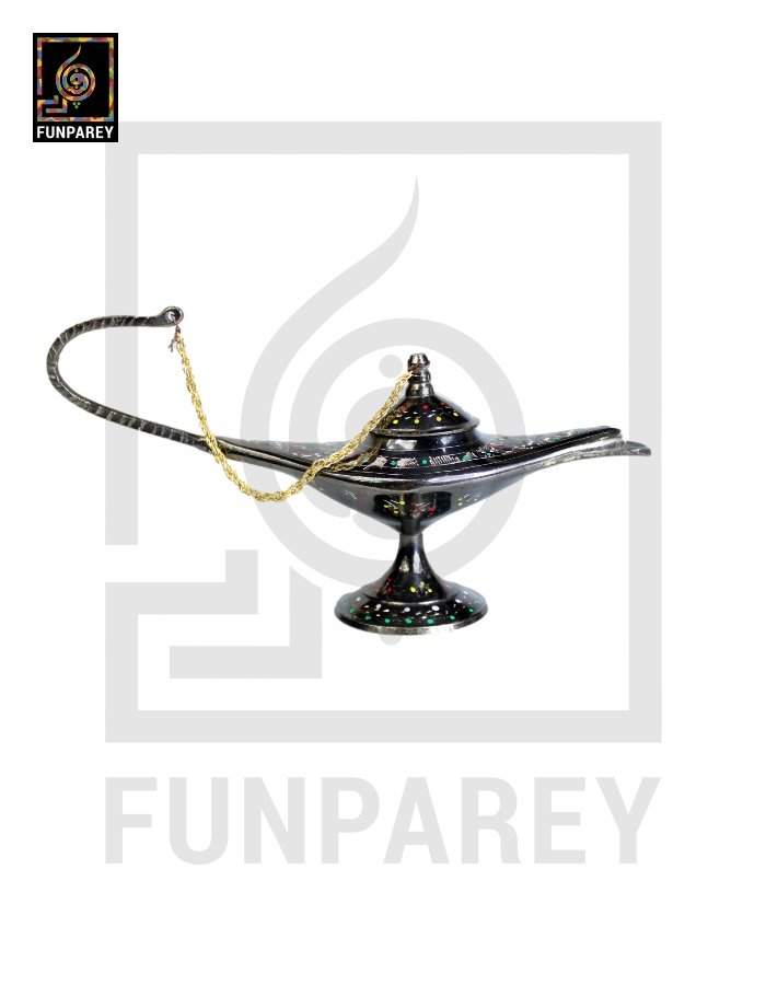 - This particular Brass Aladdin Lamp has been prepared in Dark Greenish Hue Color with Bundki and Diamond Cut work on the surface.
