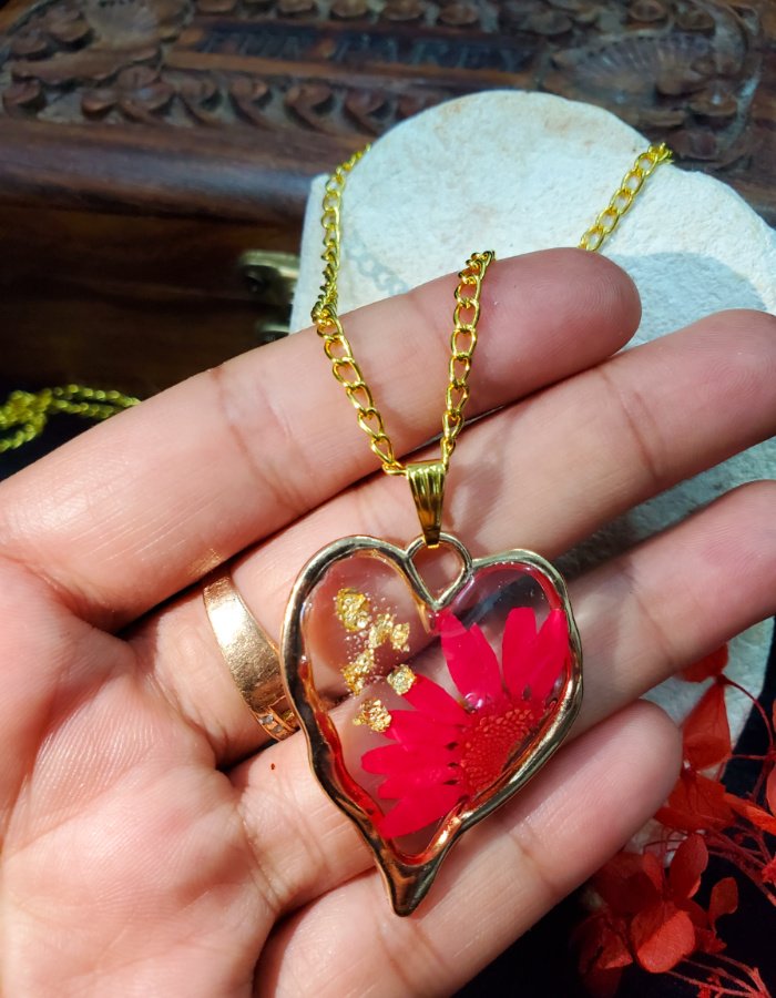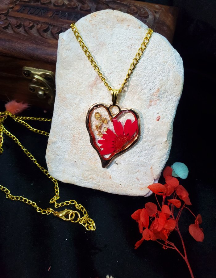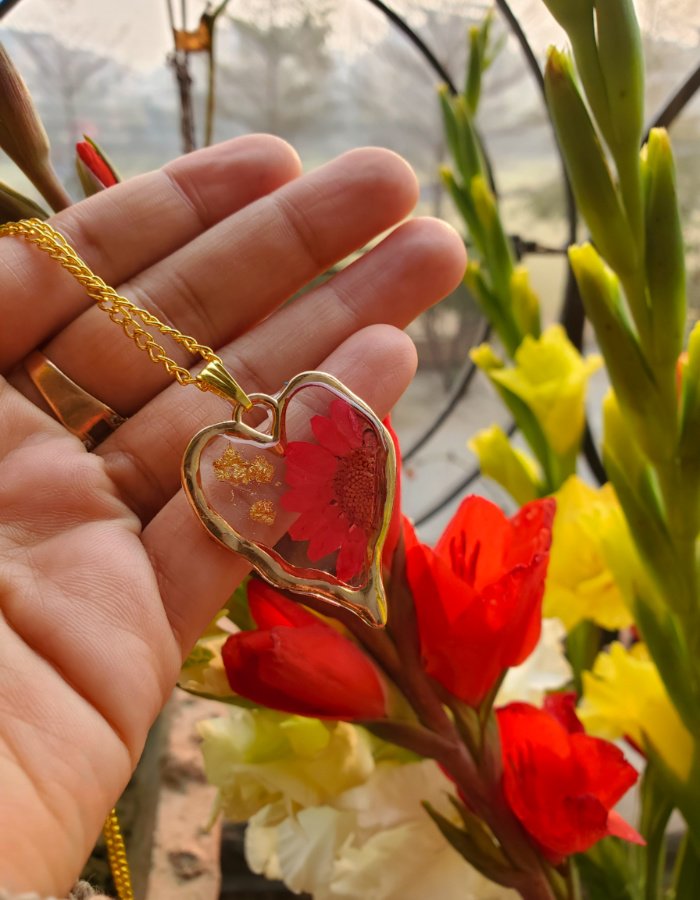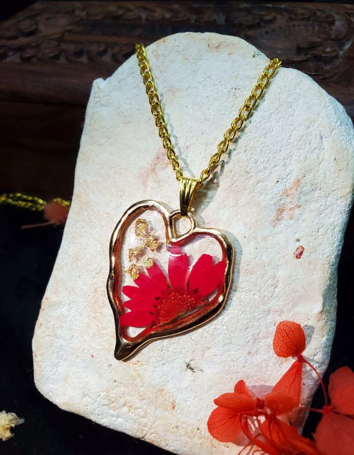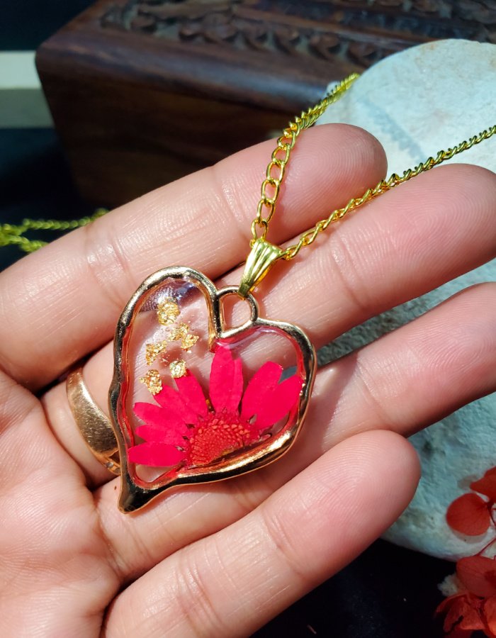 - Embedded bright red daisies — passion and vitality preserved in resin.