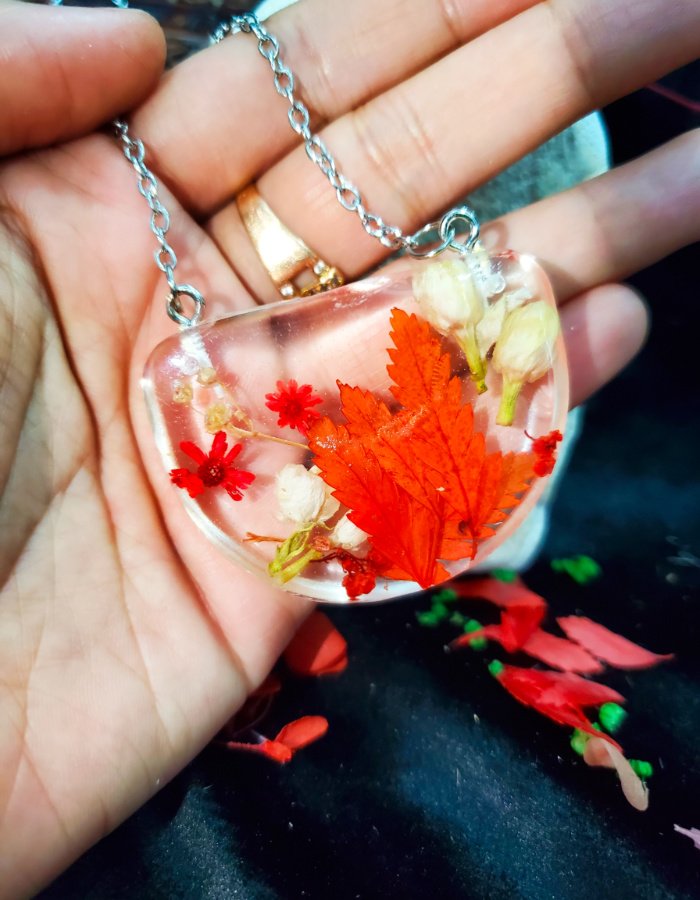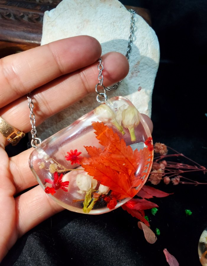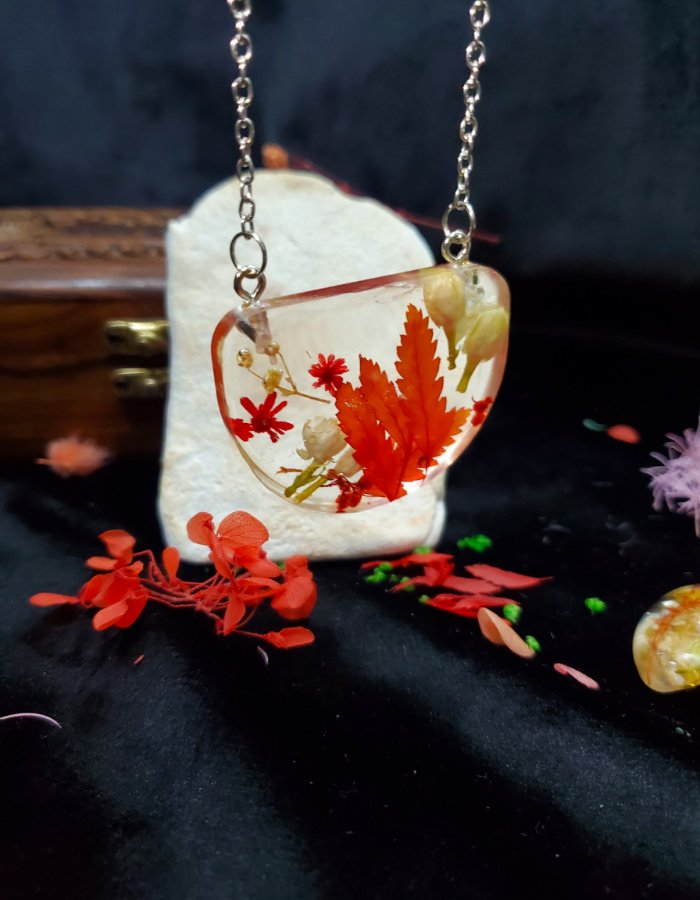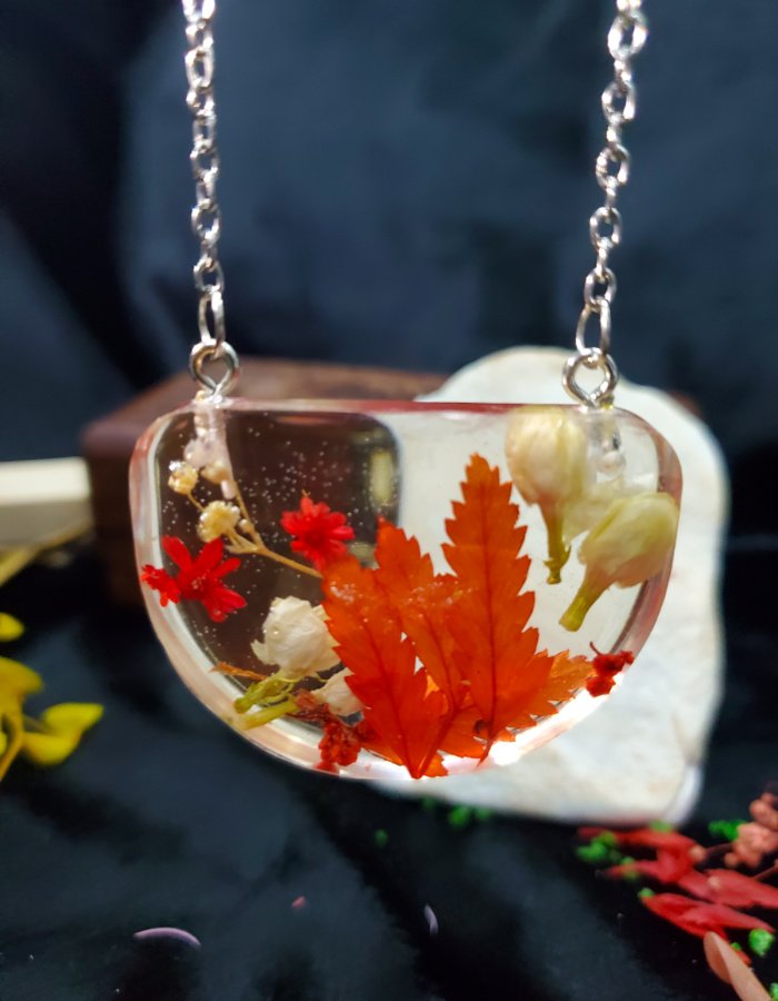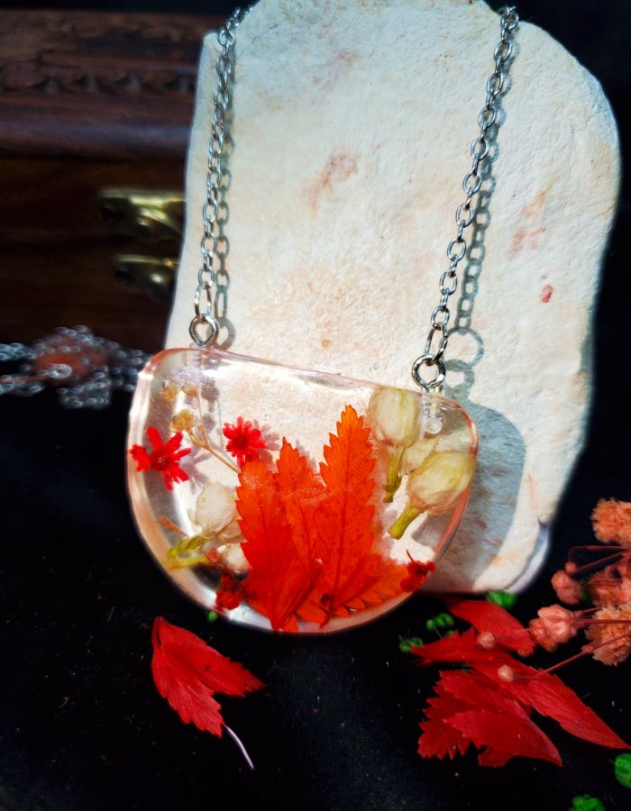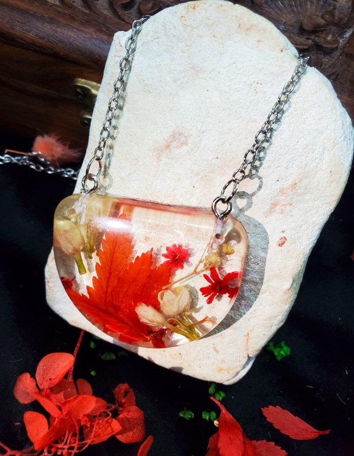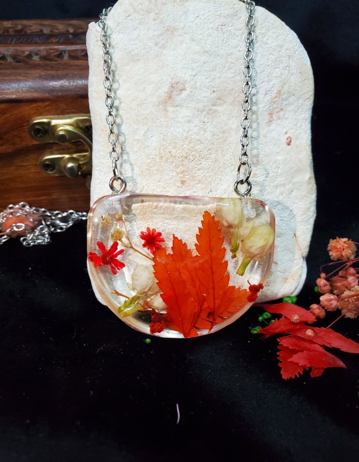- Embedded autumn leaves — vibrant red foliage preserved in resin.