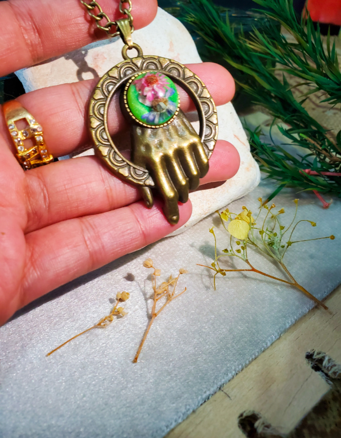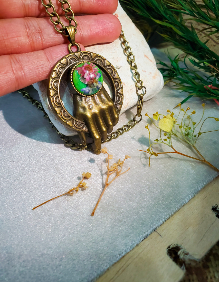 - Ornate circular frame — detailed brass patterns surround the hand, adding vintage charm and elevating the pendant into wearable art.