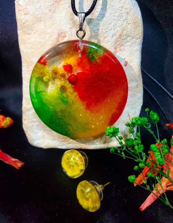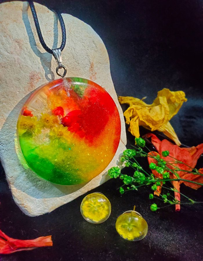 - Earrings: Matching resin earrings with floral accents
