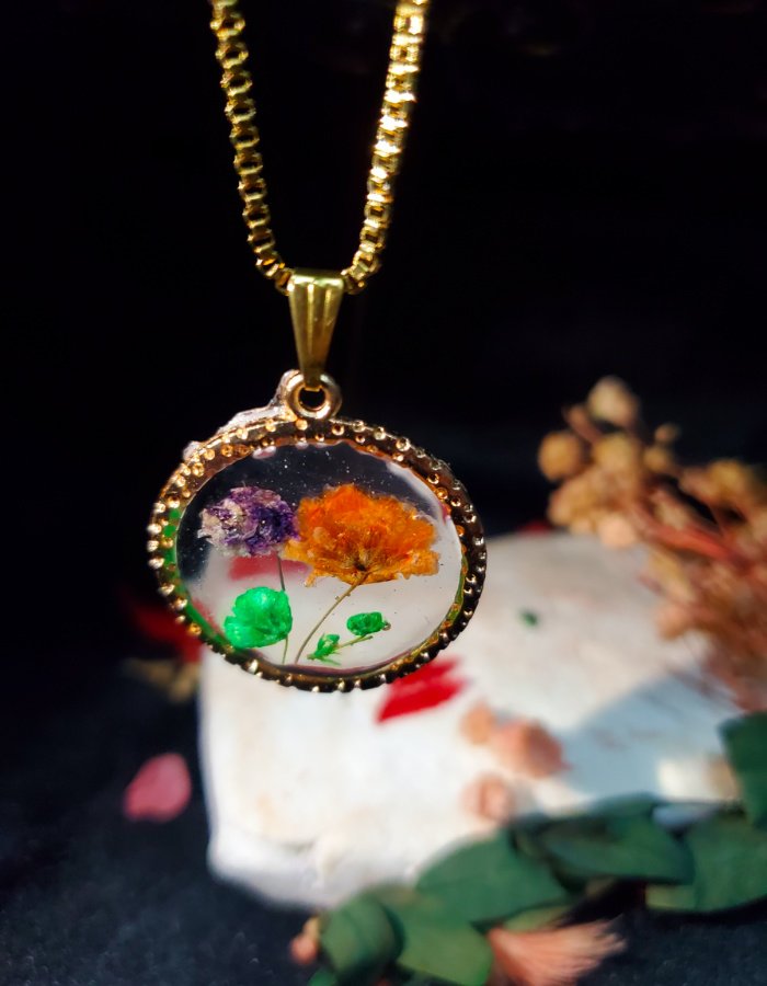• Delicate floral display — preserved orange and purple blossoms with green foliage, symbolizing nature’s fleeting beauty.