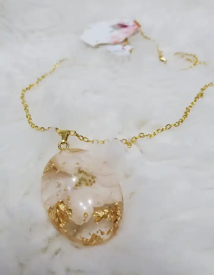 - Luxurious Gold Flakes: Infused with shimmering golden flakes that add a touch of opulence and sophistication to the pendant.
