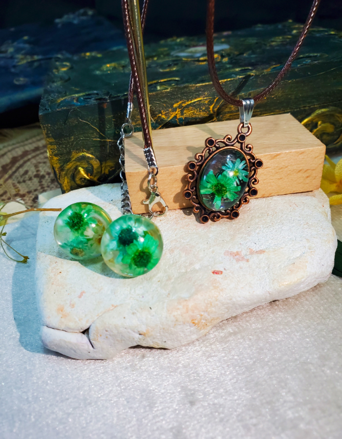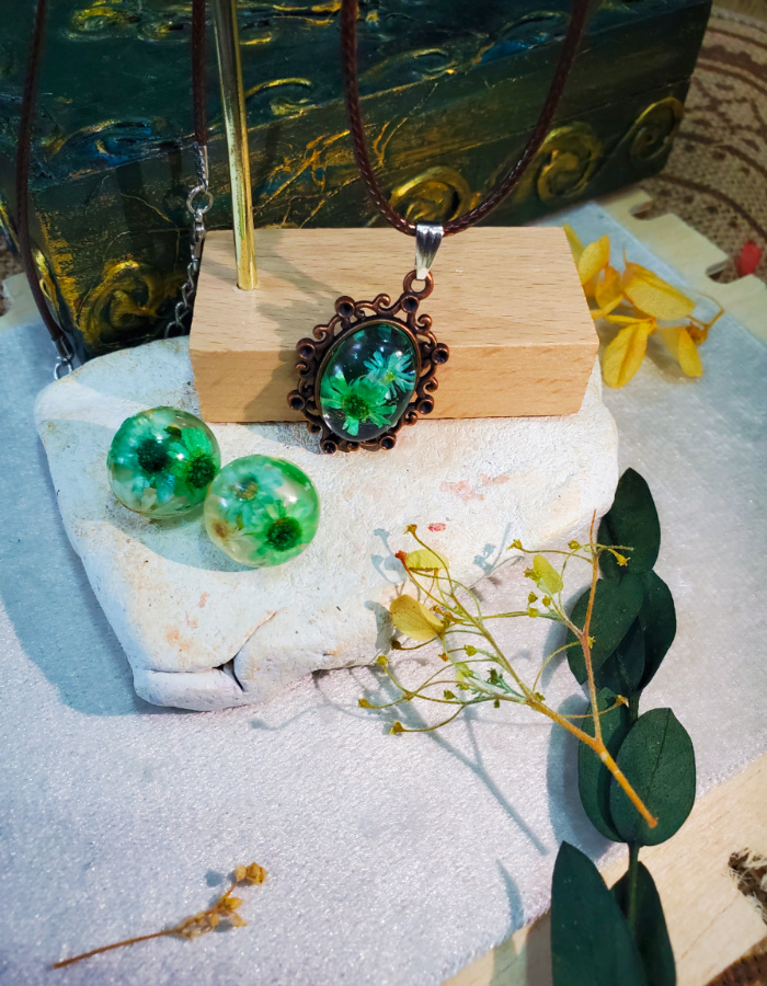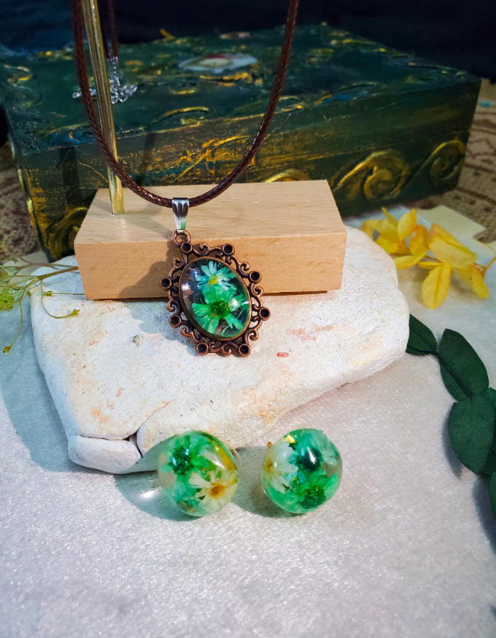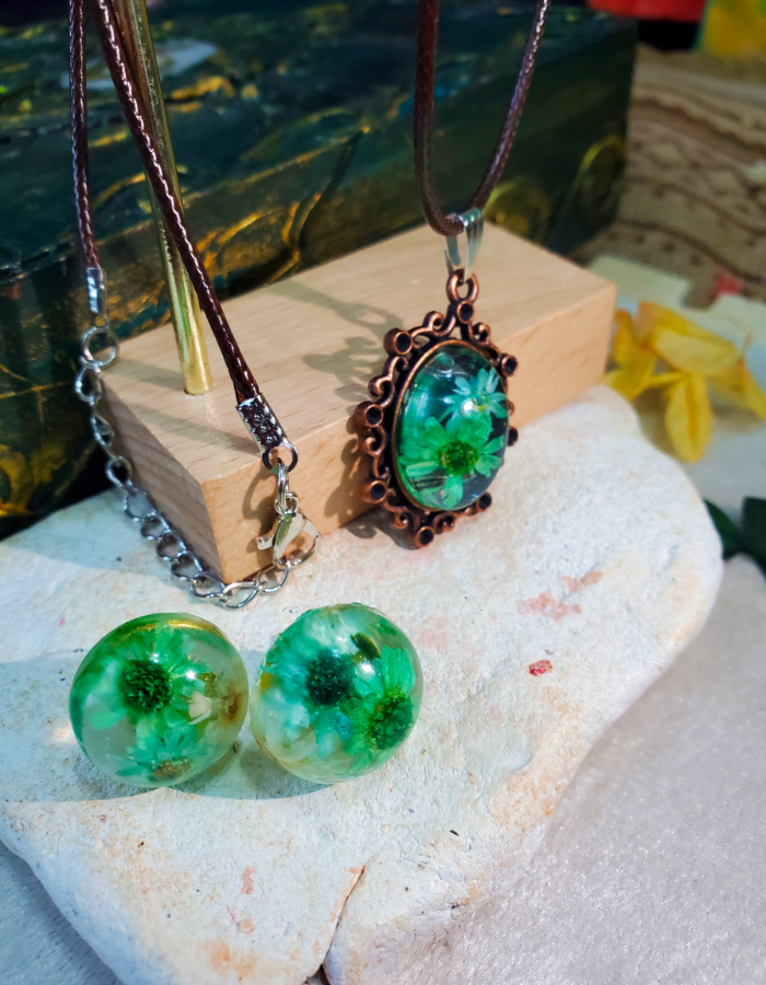 - Matching floral earrings — resin spheres echo the pendant’s charm, completing the ensemble with balance and elegance.