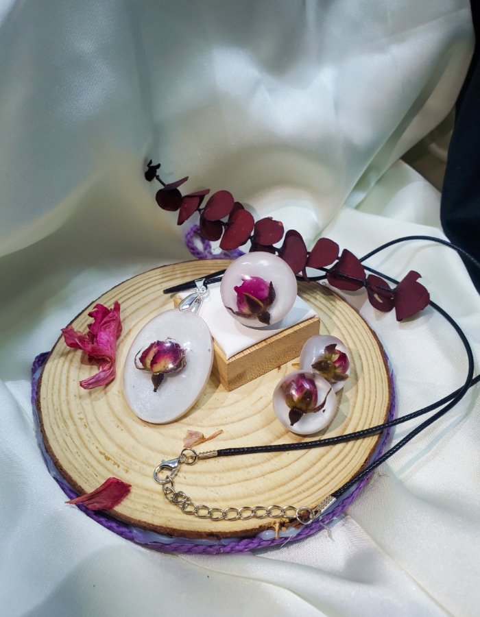 • Earrings: Matching dome-shaped floral resin earrings, lightweight and graceful