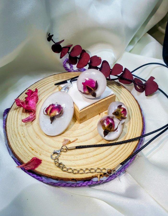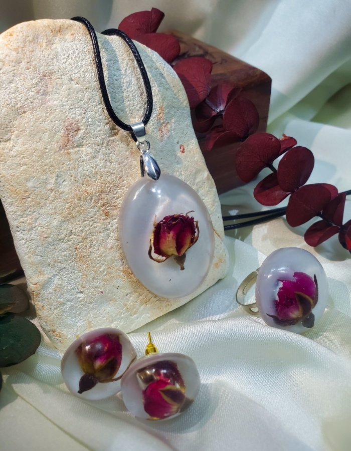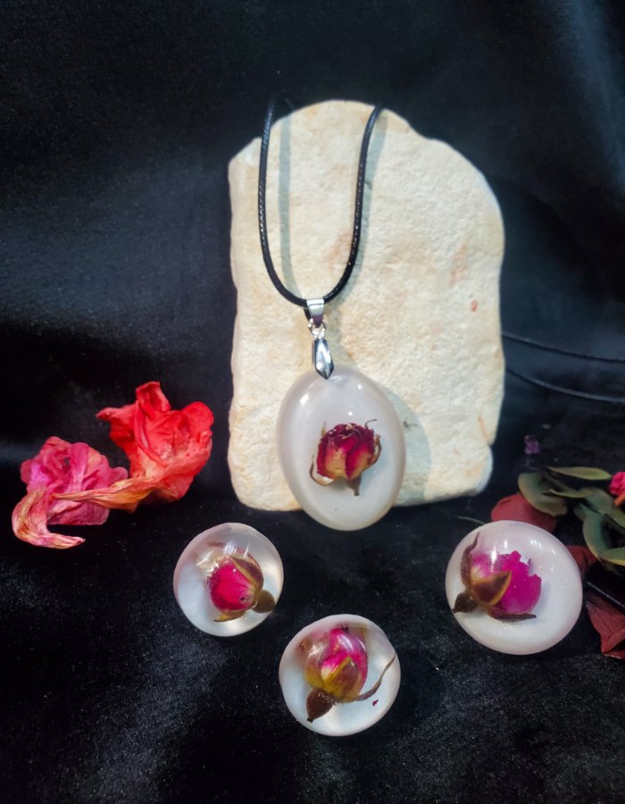 • Resin Base: Clear resin, magnifying the natural rosebud beauty