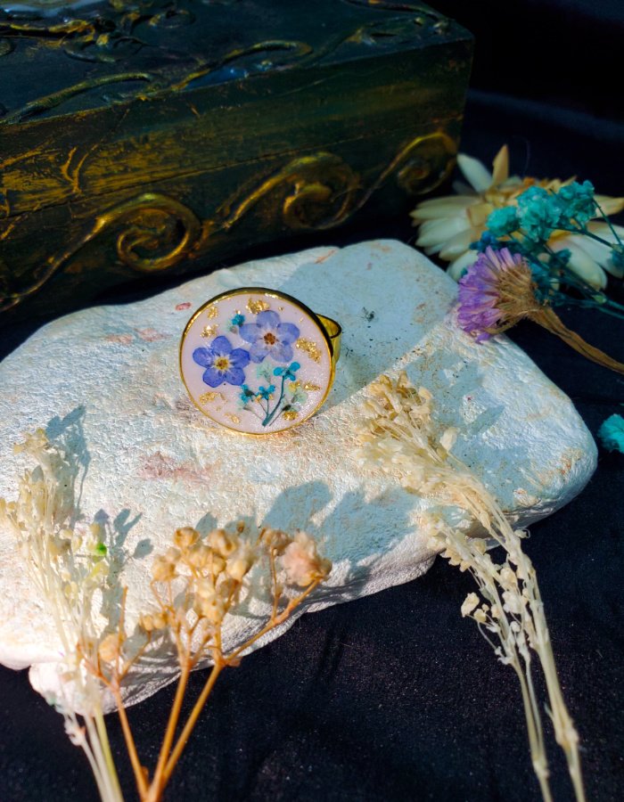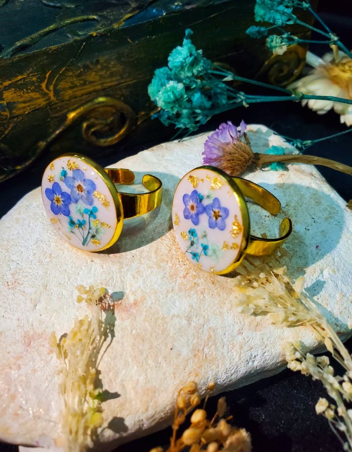 - Circular resin earrings with embedded dried flowers — a miniature bouquet sealed in glossy resin
