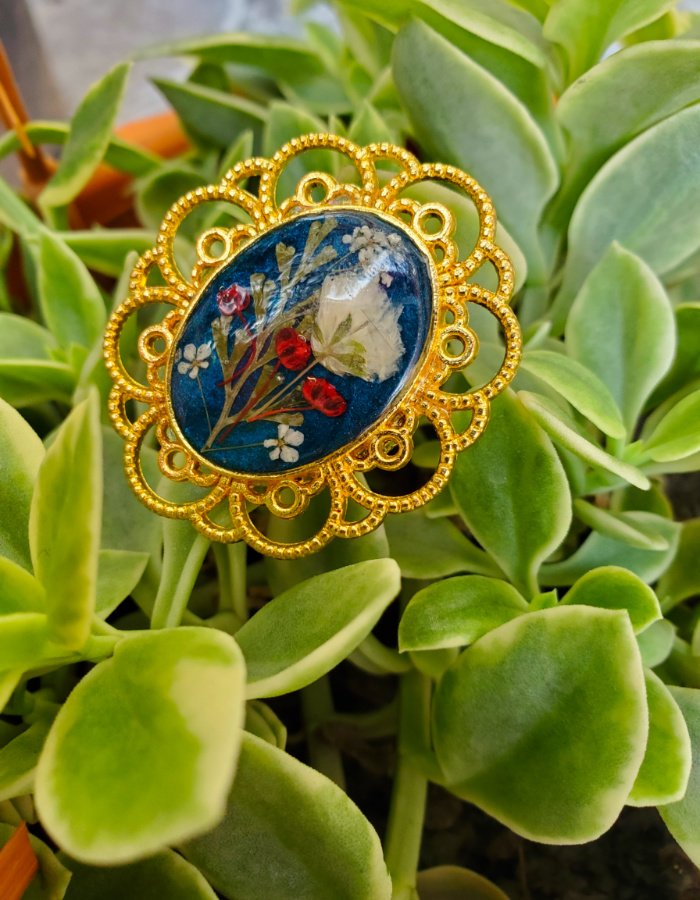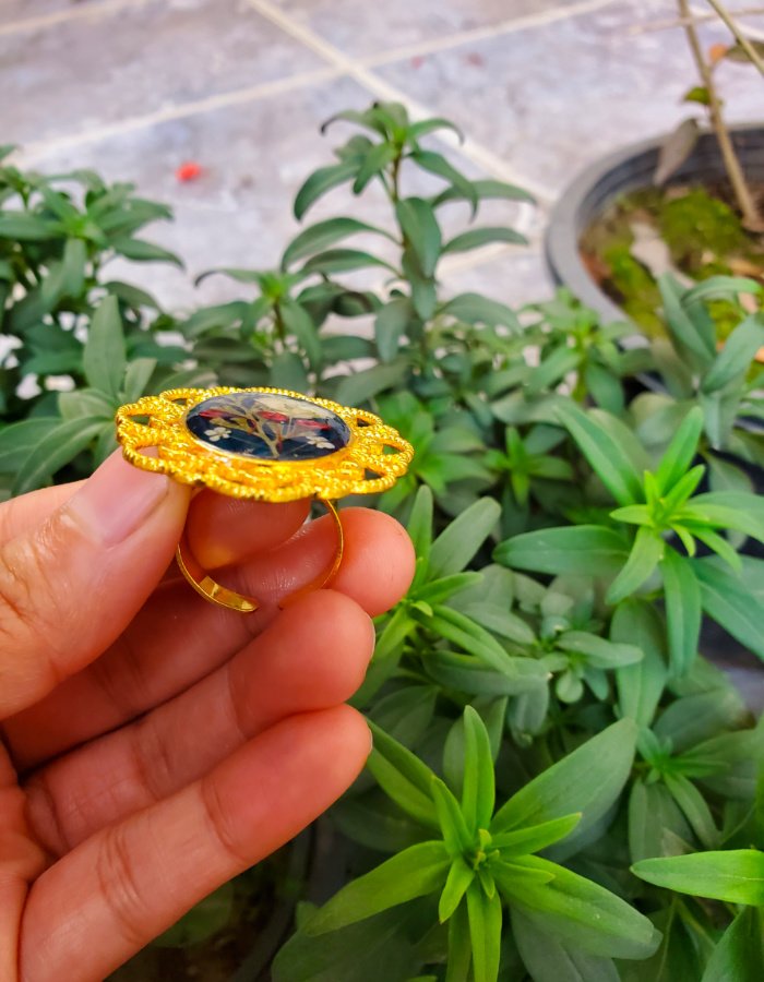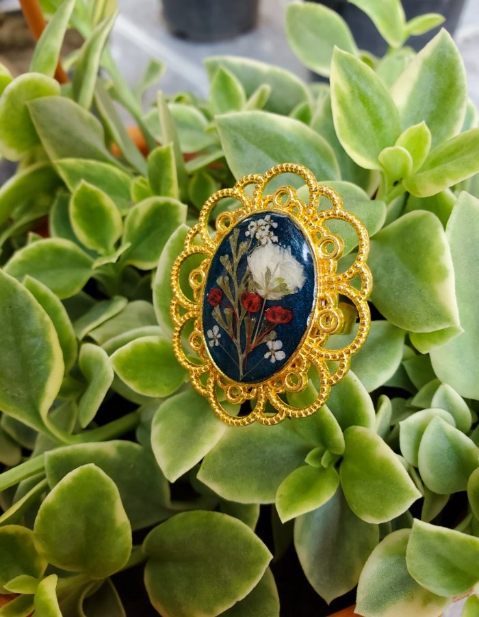 - Oval-shaped resin ring with embedded dried flowers — a miniature bouquet sealed in glossy resin