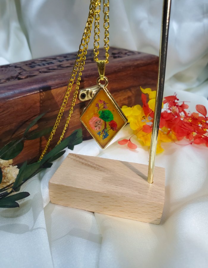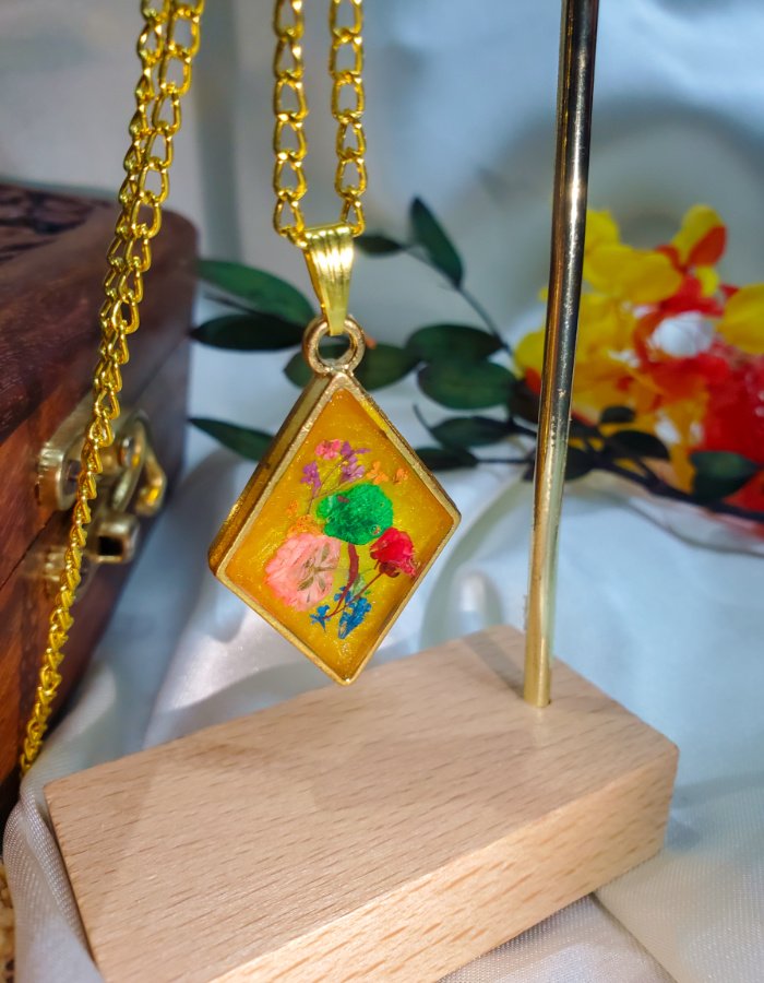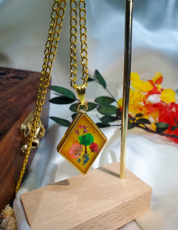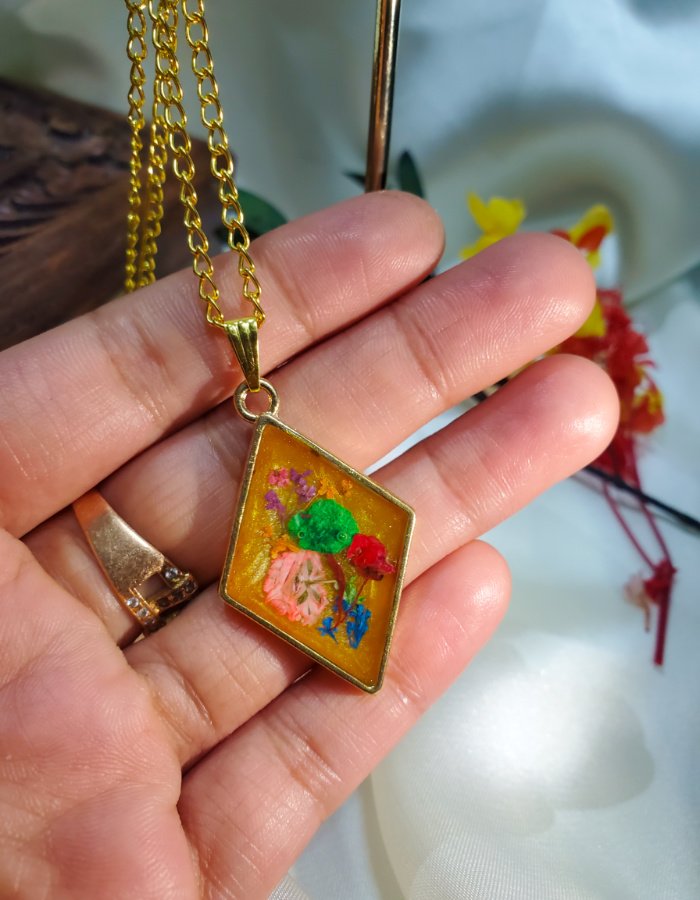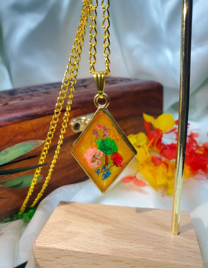• Floral Composition: Dried flowers in green, pink, red, purple, and blue, preserved in clear resin