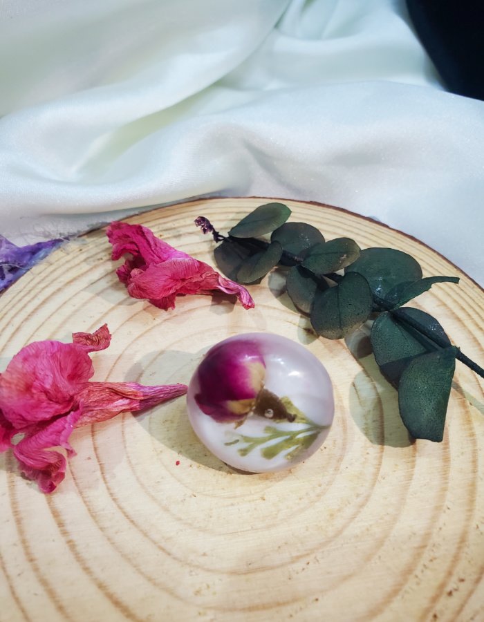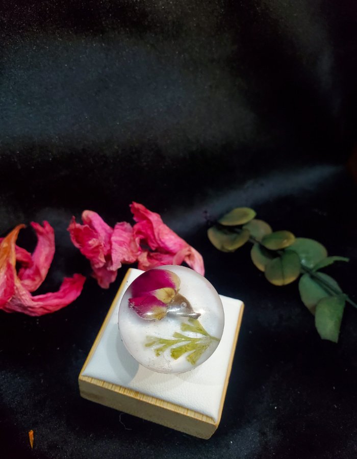 - Resin Base: Clear resin, magnifying the rosebud’s natural beauty