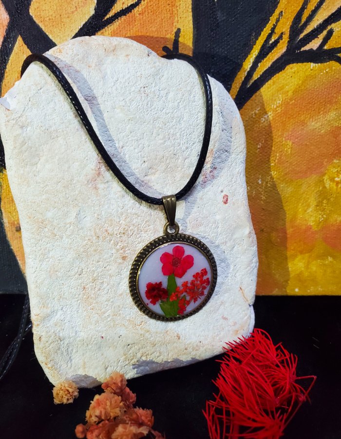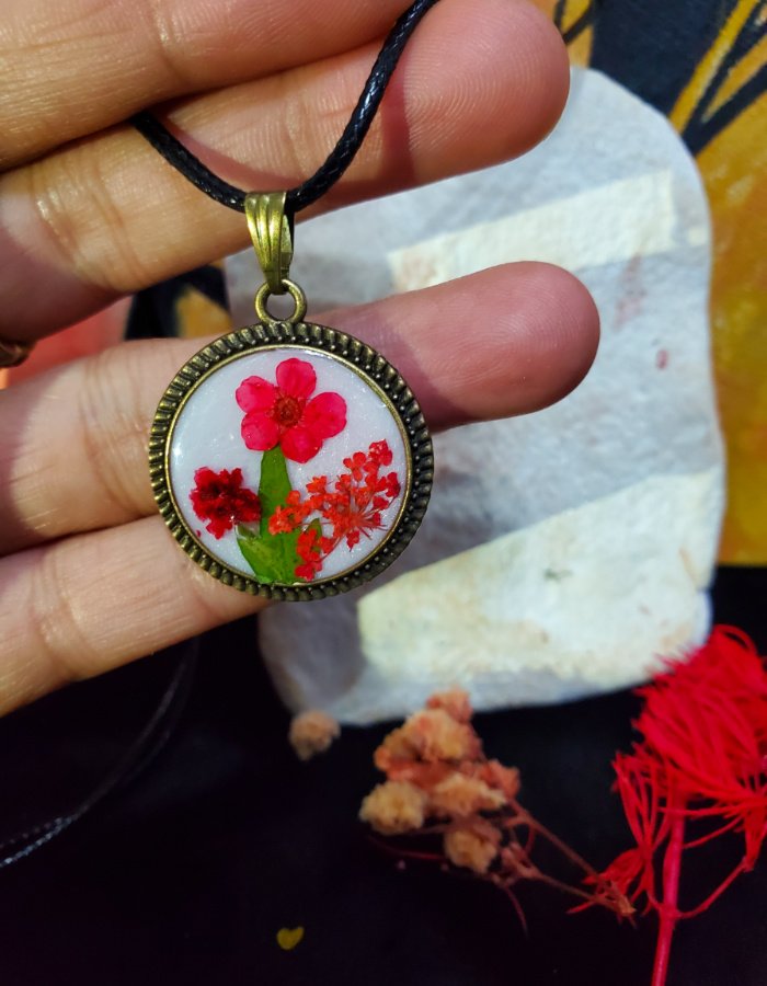 - Circular pendant with brass-toned ornate frame — a graceful design with timeless charm.