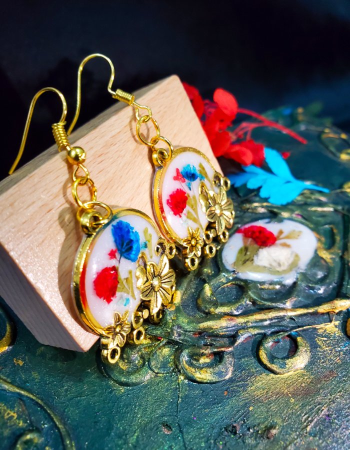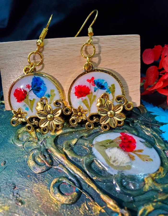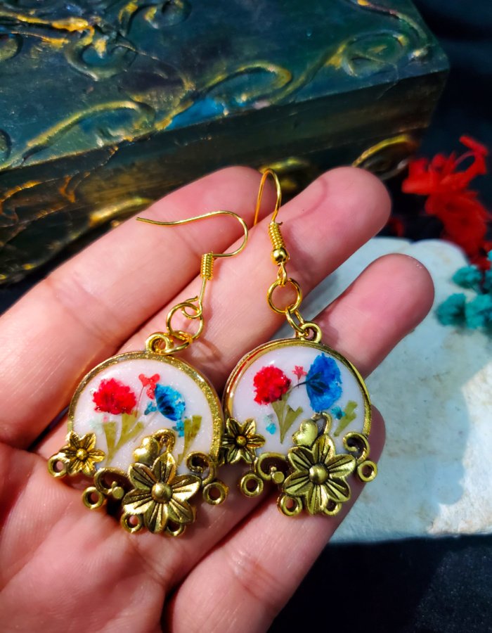 • Circular resin earrings with embedded dried flowers — a miniature bouquet sealed in glossy resin