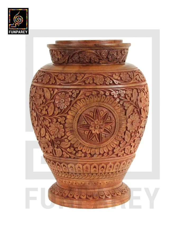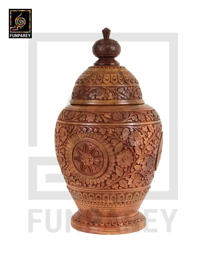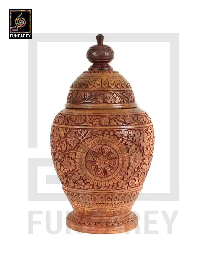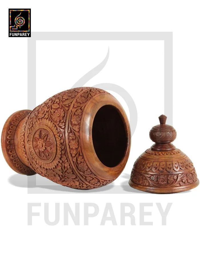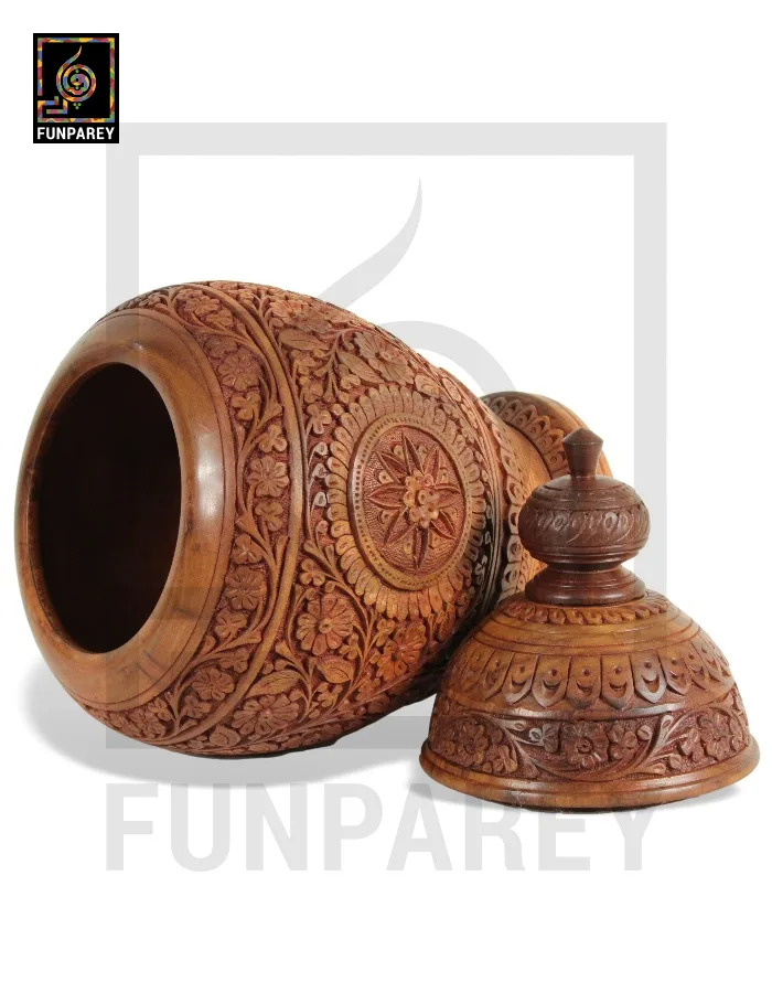 - The Jar is fully handmade from a single piece of wooden Solid Log and beautifully decorated with carving works.