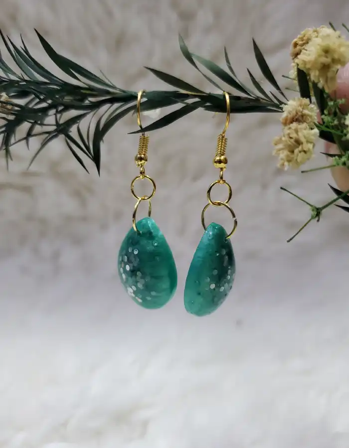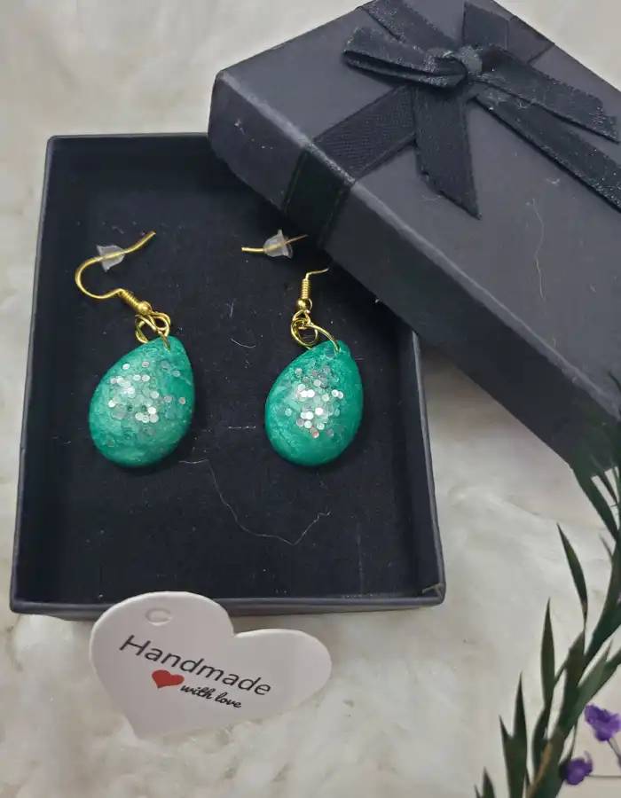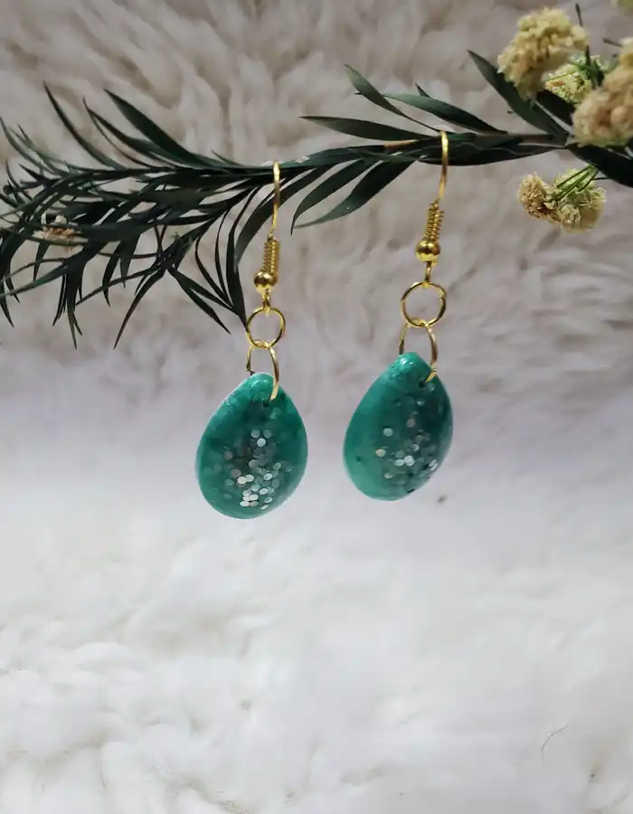 Handcrafted Resin Earrings - Green With Silver Glitters