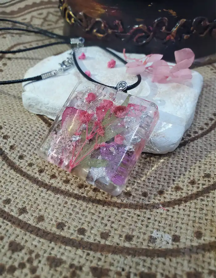 - Clear resin with multicolor dried flowers and green leaves