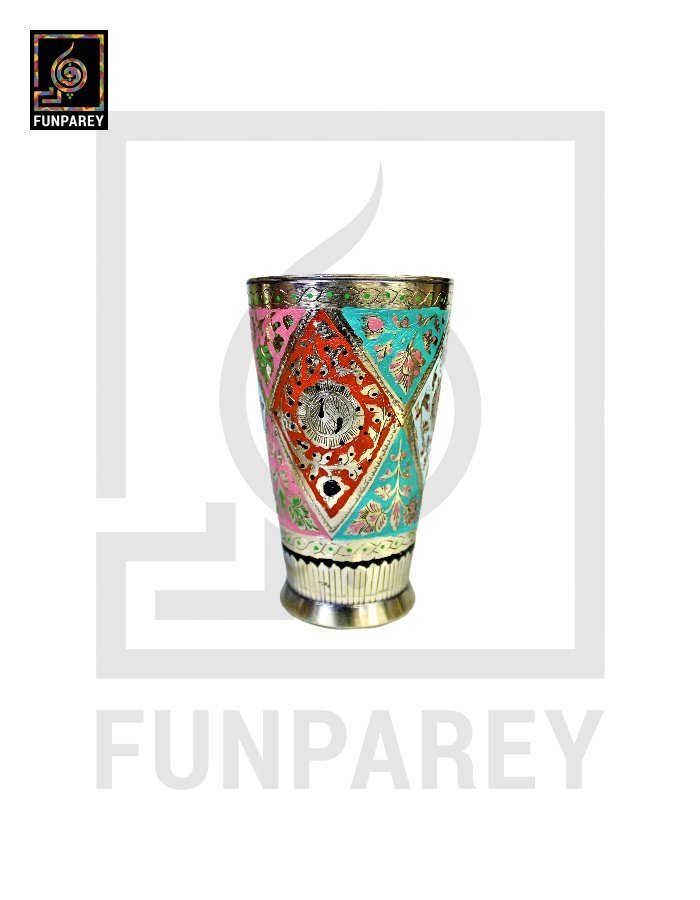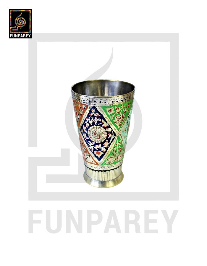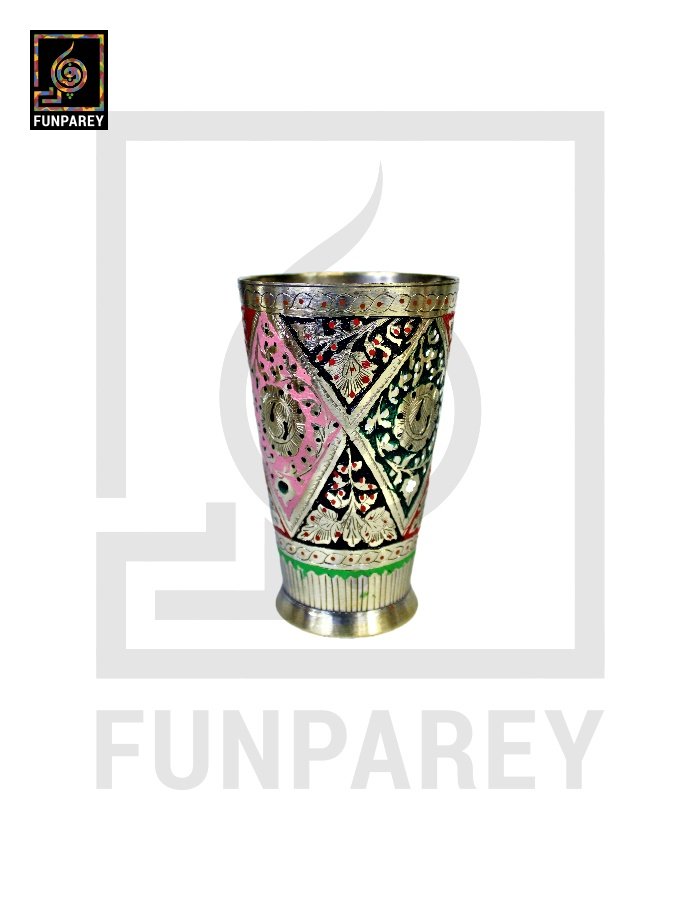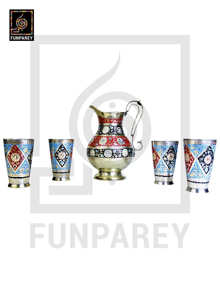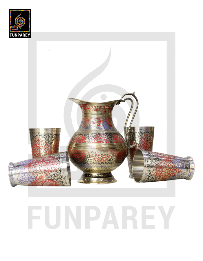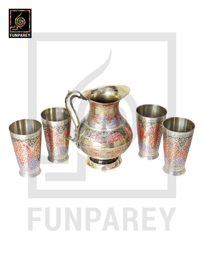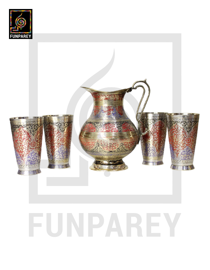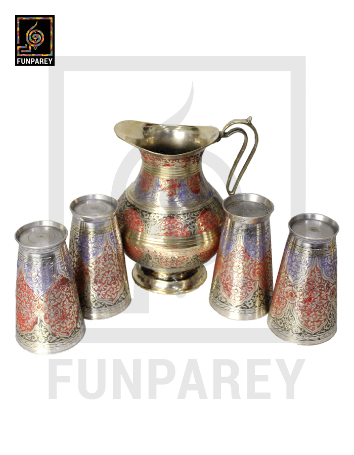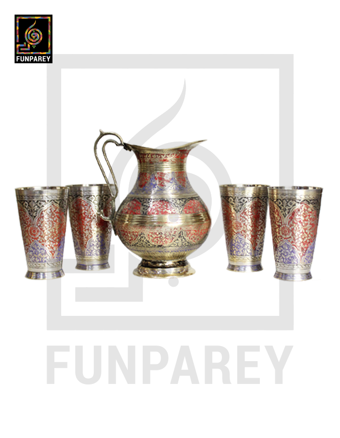 - The Brass jug and Glasses are neatly decorated with colored Motif designs.