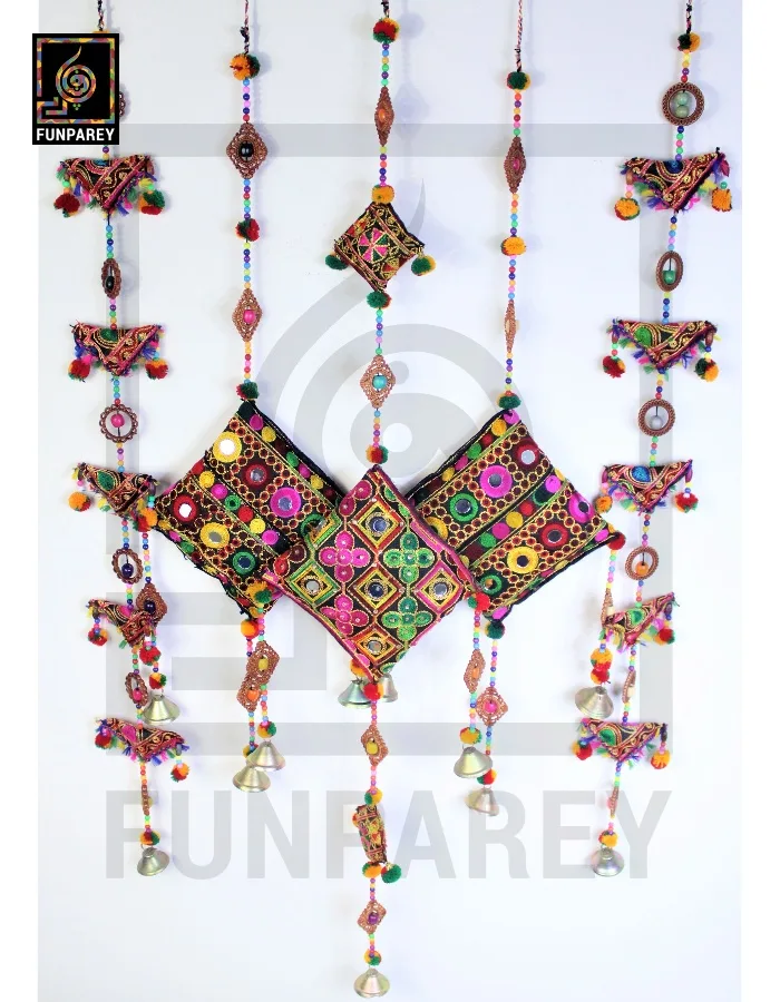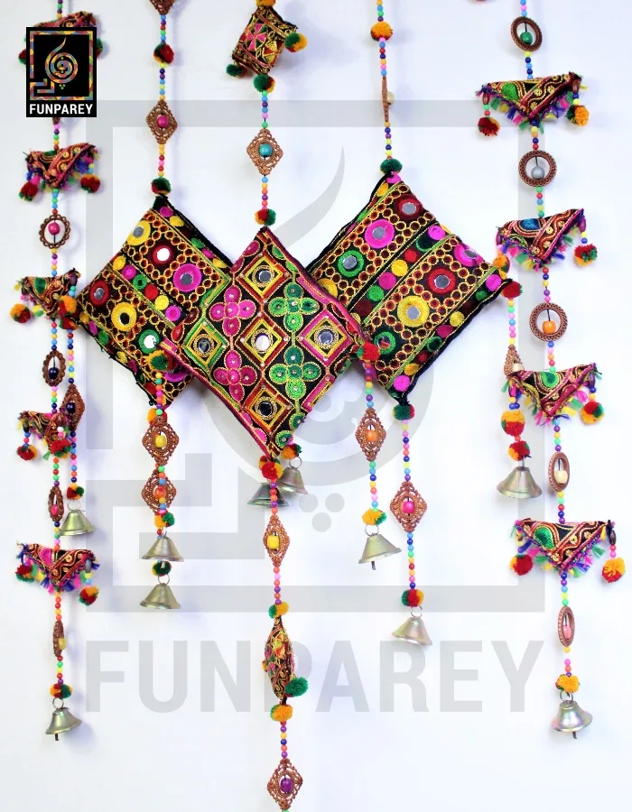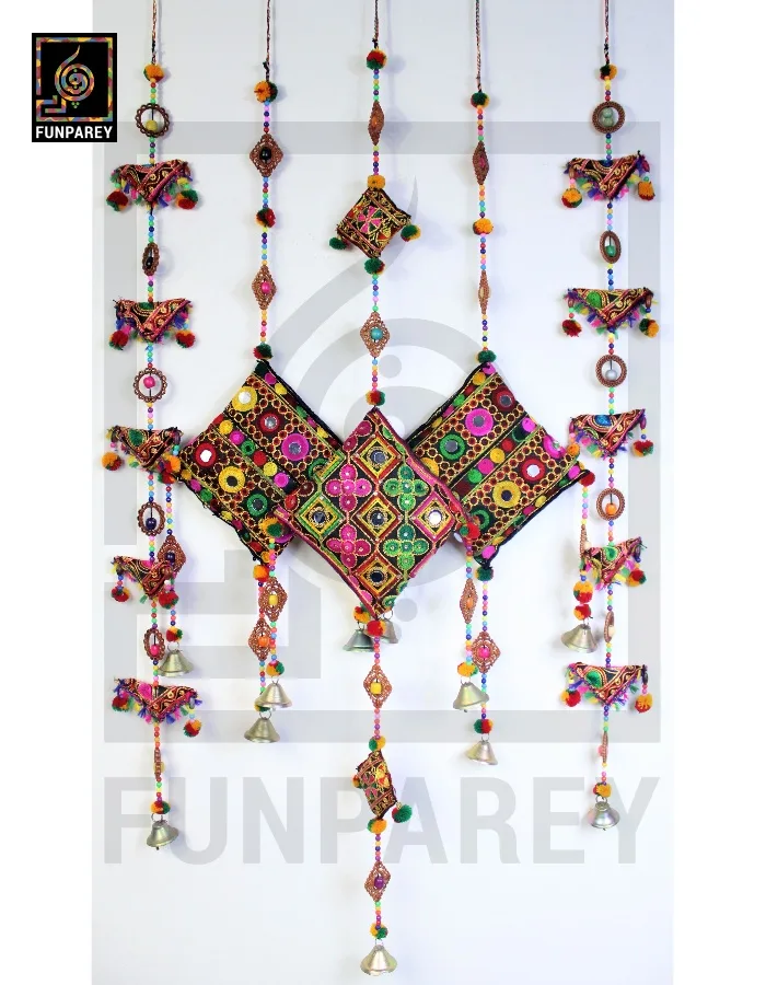 Handmade Antique Embroidered Cushion Door Chime (Set of 5) (1 Large, 2 Small and 2 Triangle Chimes)