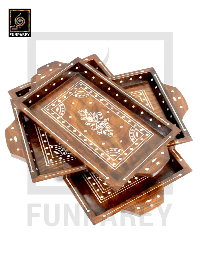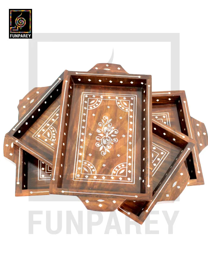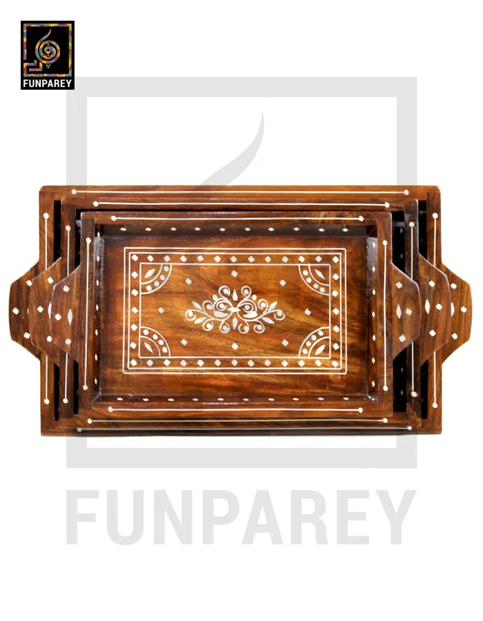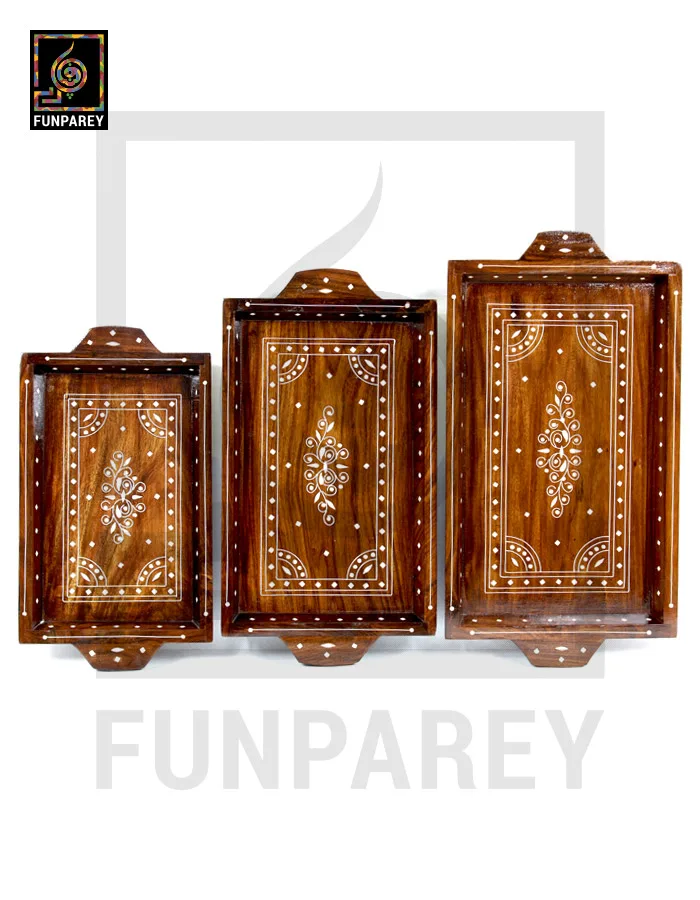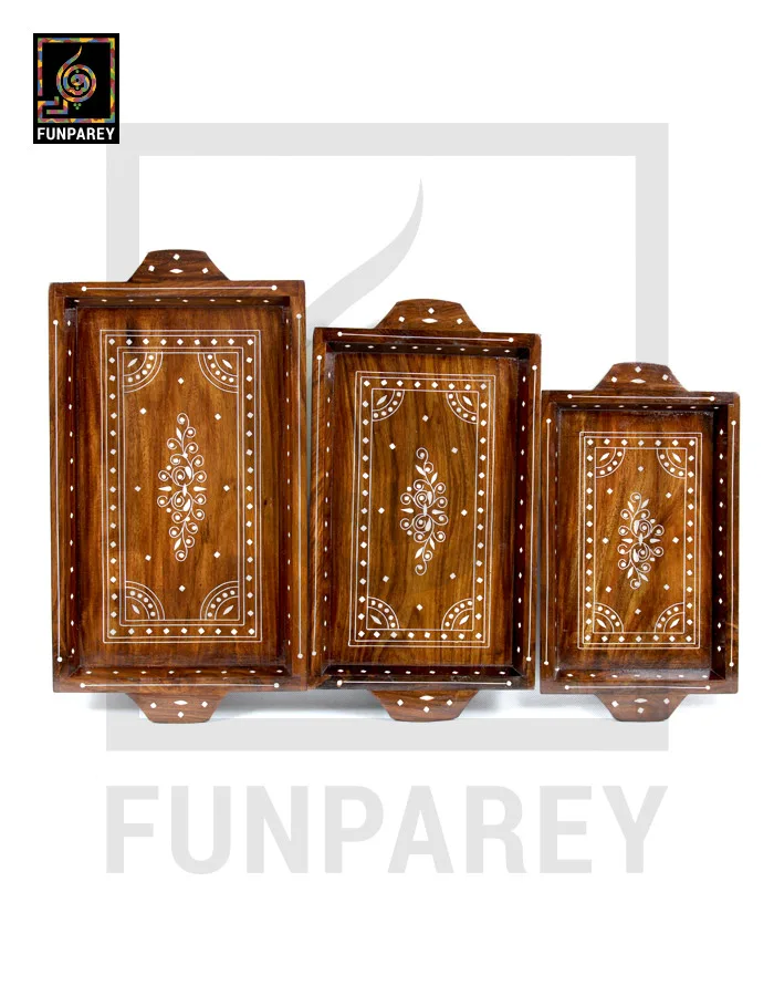 Handmade Wooden Tray Set With White Plastic Work (3 Trays)