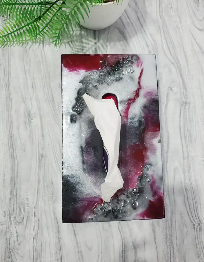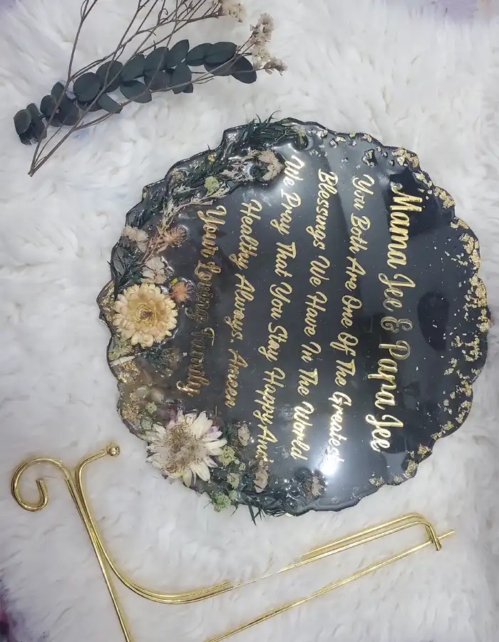 - Floral Arrangement: Showcases white, green, and red wild pressed flowers encapsulated in resin.