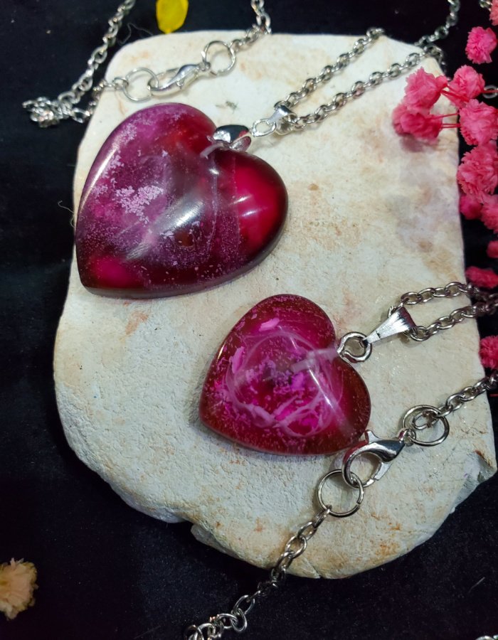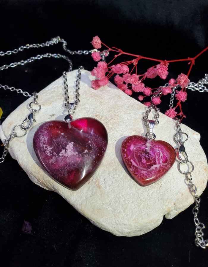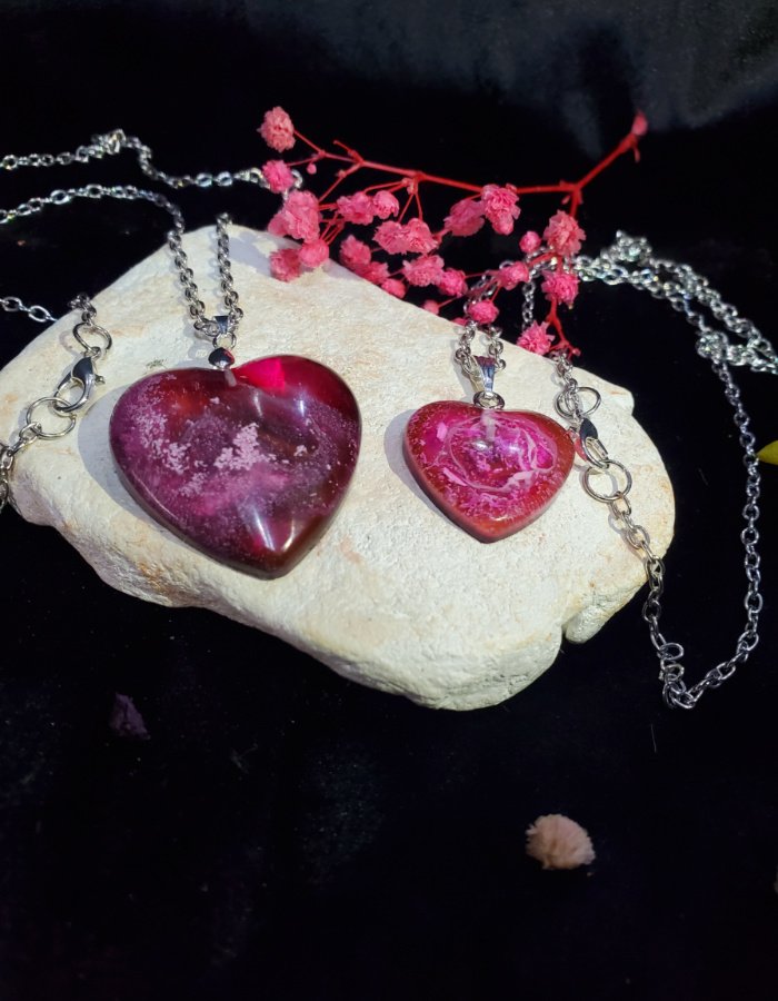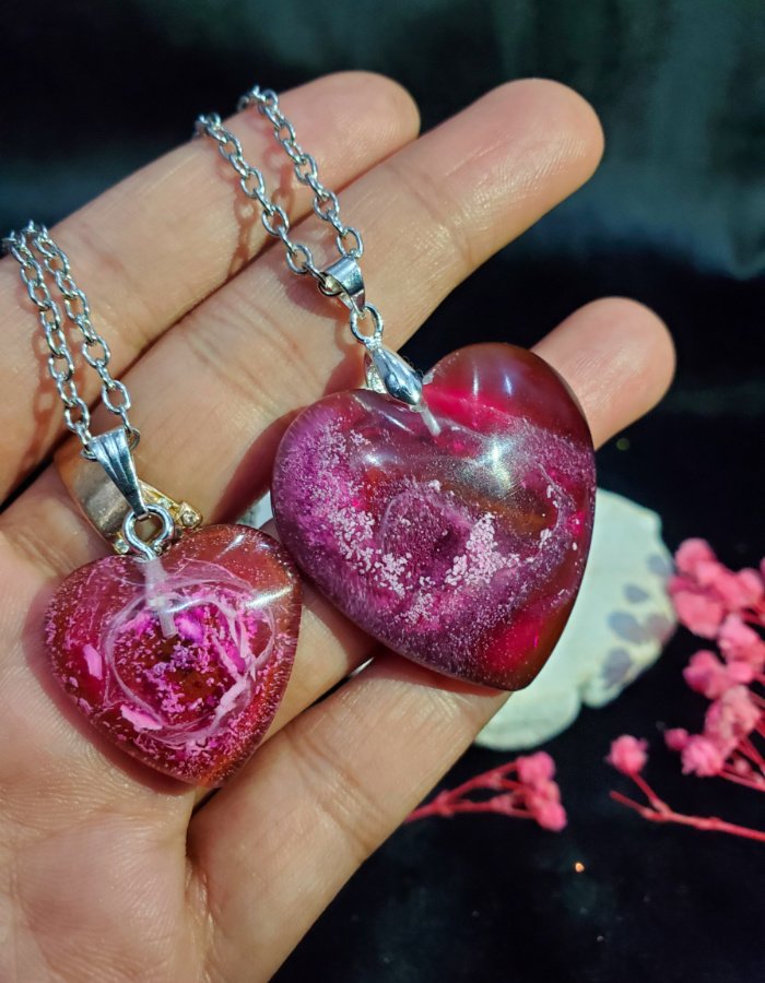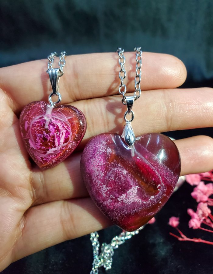 - Red and pink resin with marbled and speckled patterns — distinct designs that echo shared emotion.