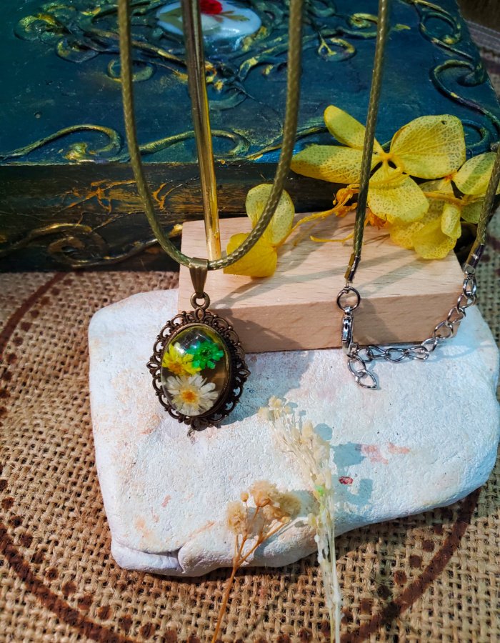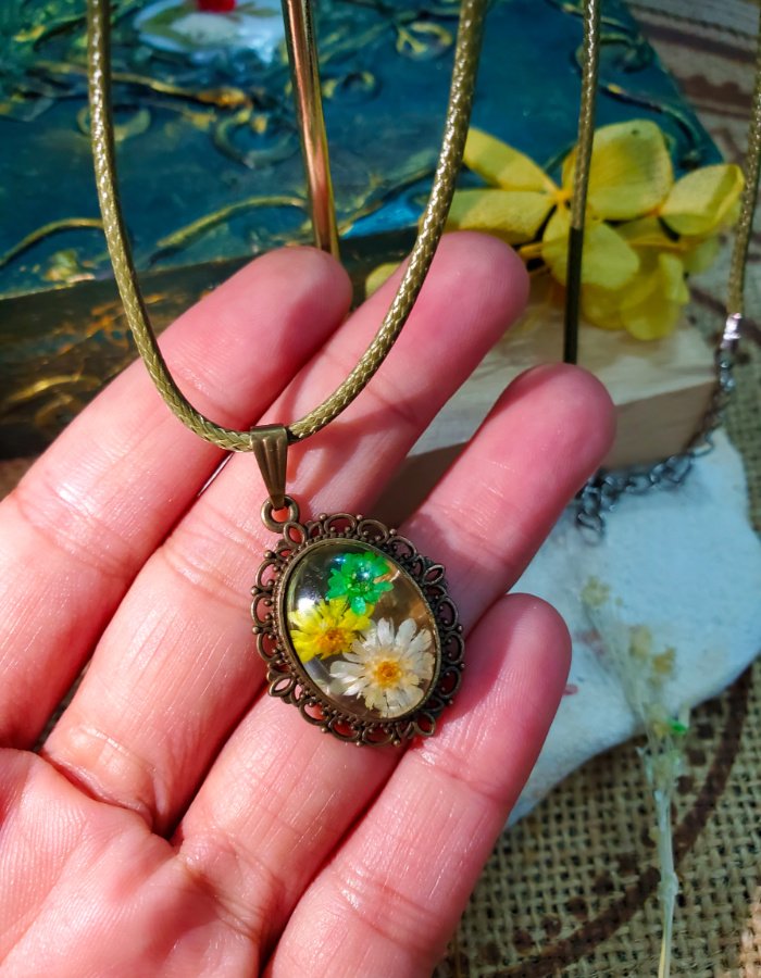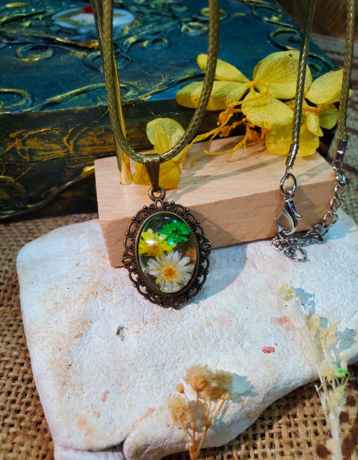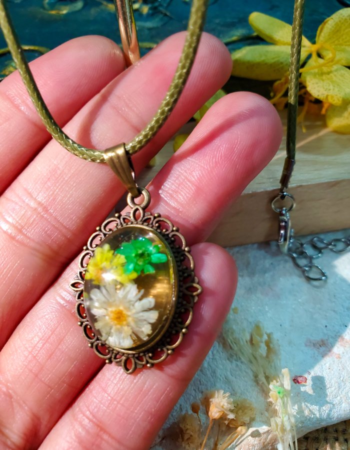 • Oval resin centerpiece — luminous clarity showcasing natural floral detail.