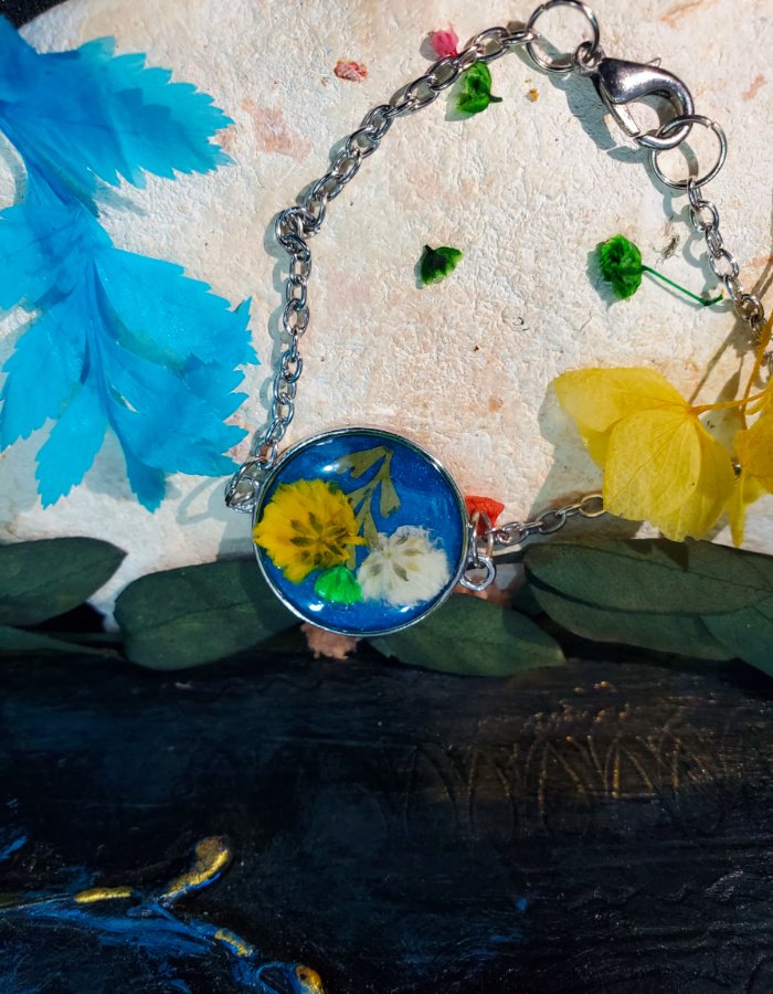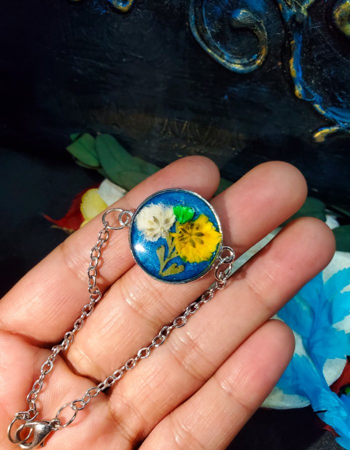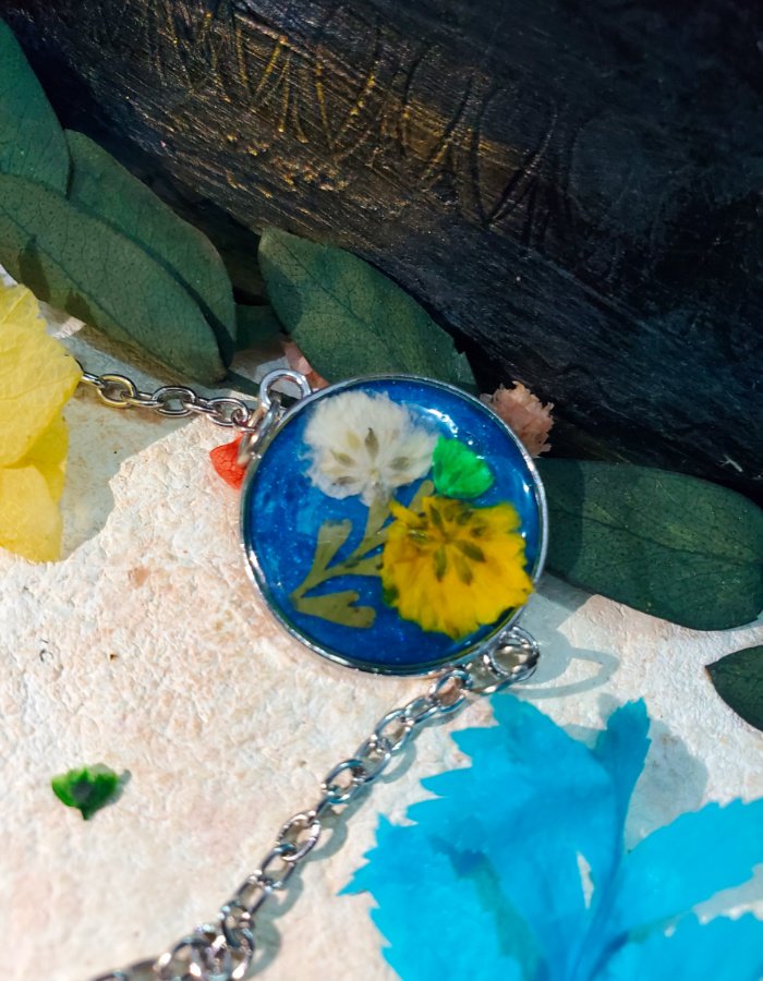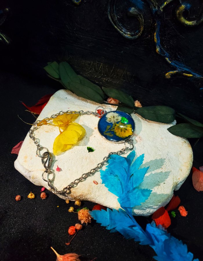 - Preserved blossoms in deep-blue resin — glowing with purity, creativity, and grace.