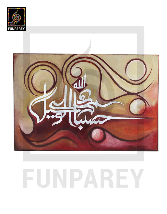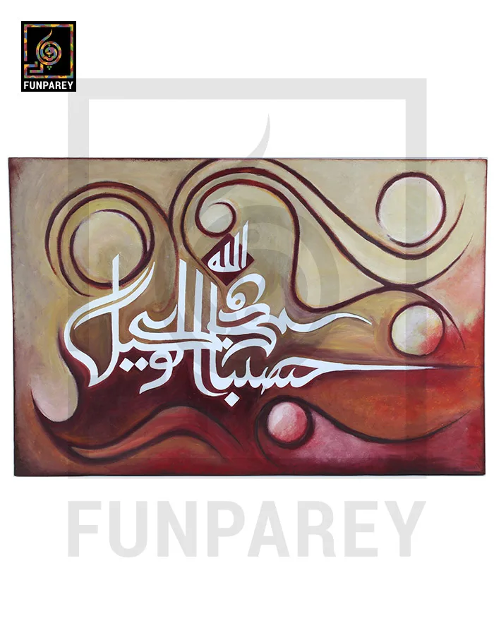 - The Islamic calligraphy on the colorful abstract is a Verse from Quran of Surah Al ‘Imran 3:173 – Hasbunallahu wa ni’mal wakil (حَسْبُنَا اللَّهُ وَنِعْمَ الْوَكِيلُ) Which means “Allah (alone) is sufficient for us, and He is the best disposer of affairs (for us).