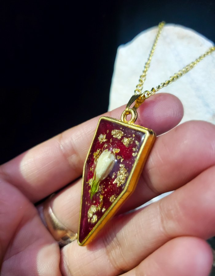 - Jasmine Bud Design – Preserved jasmine sealed in glossy red resin