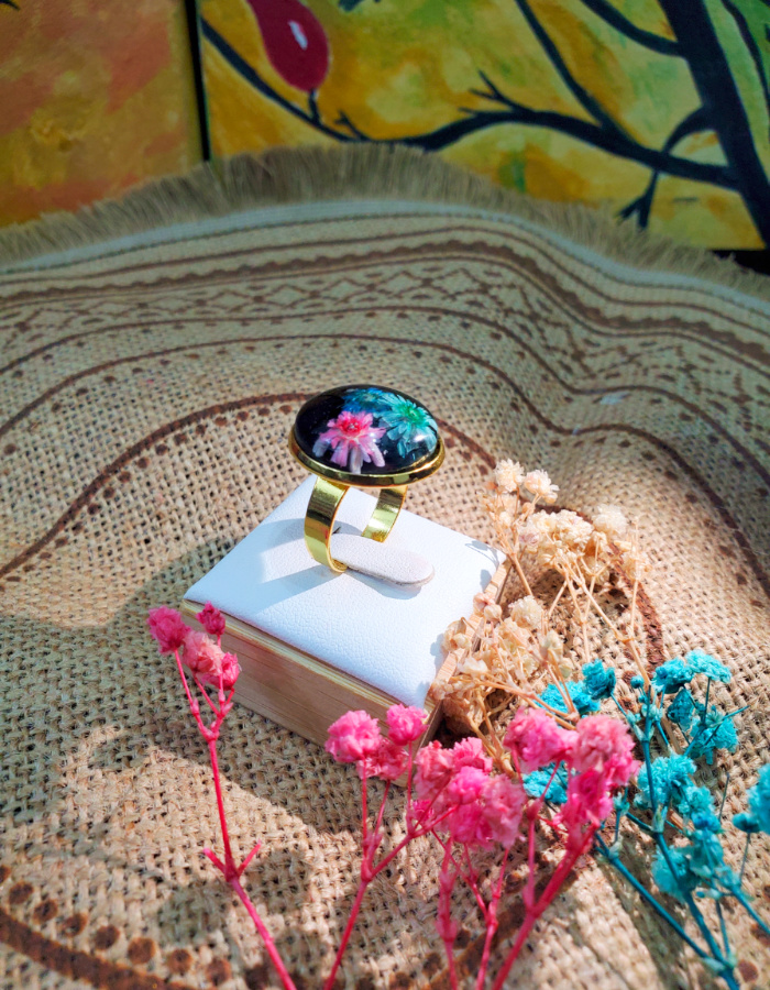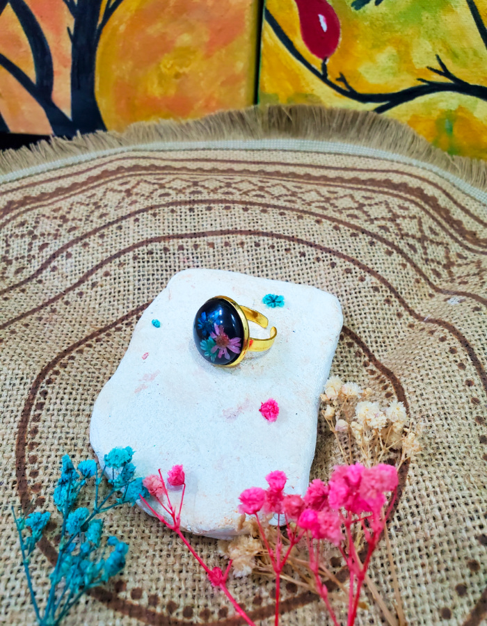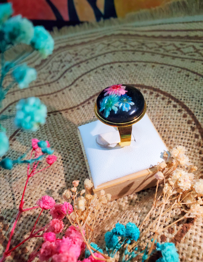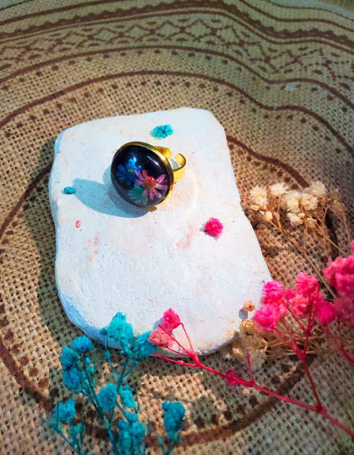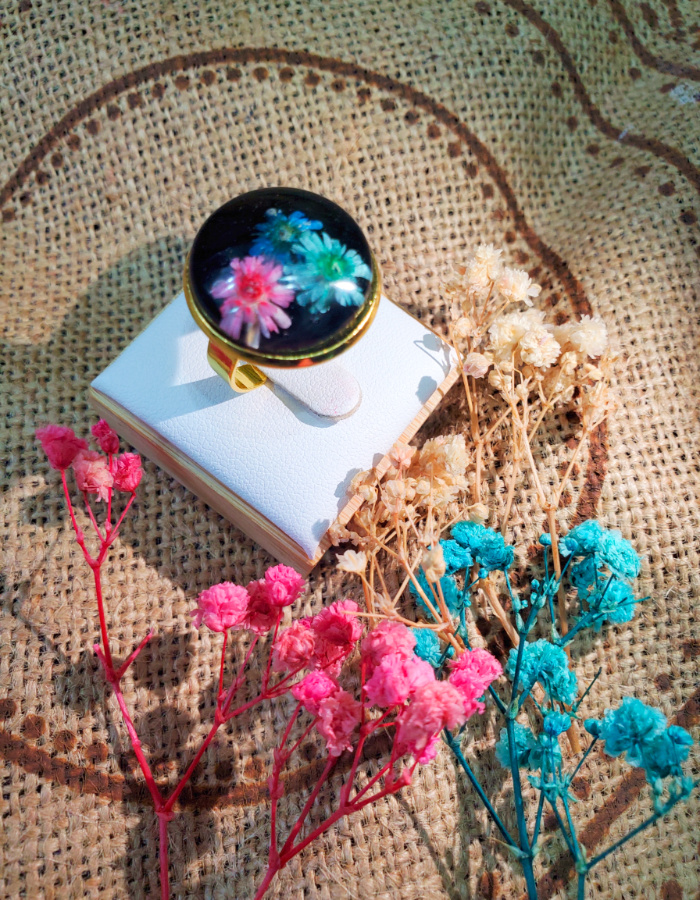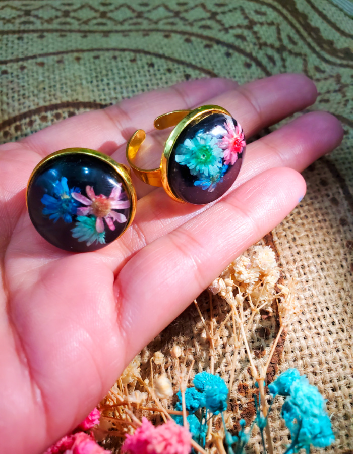- A circular resin ring cradling a miniature bouquet — real dried blossoms and foliage preserved forever in glossy resin.