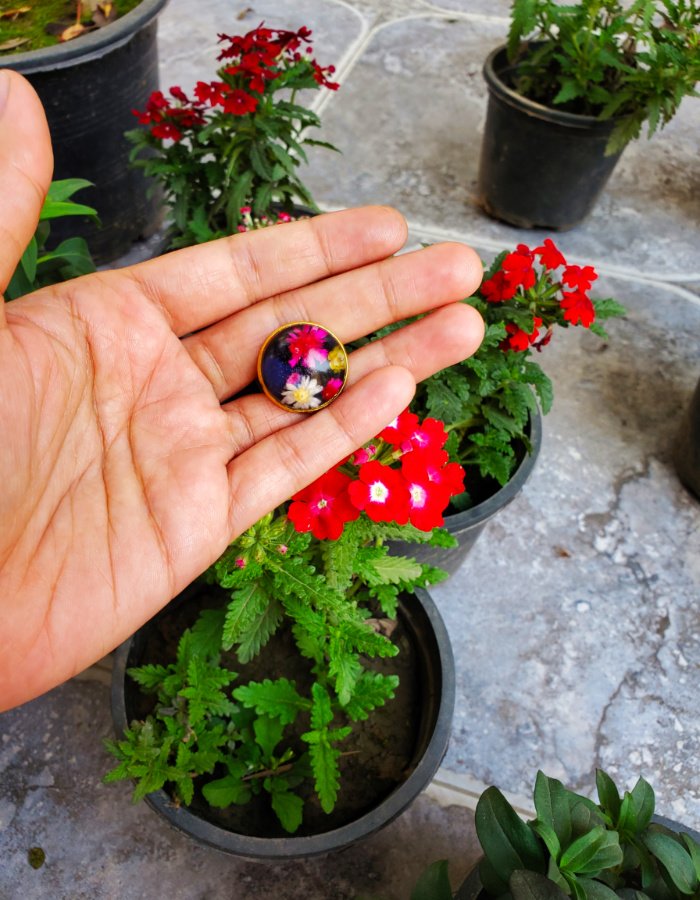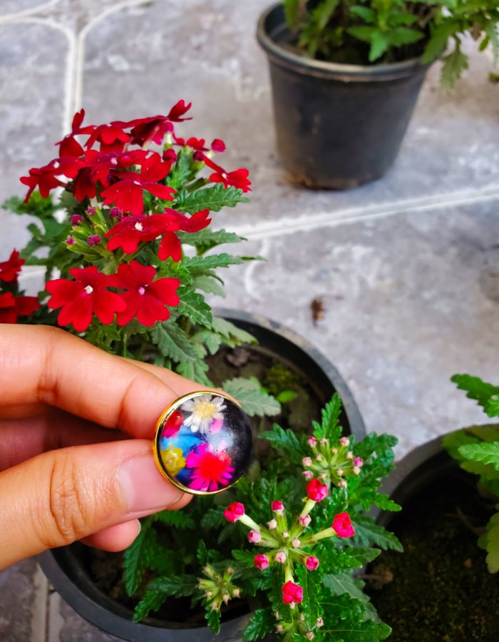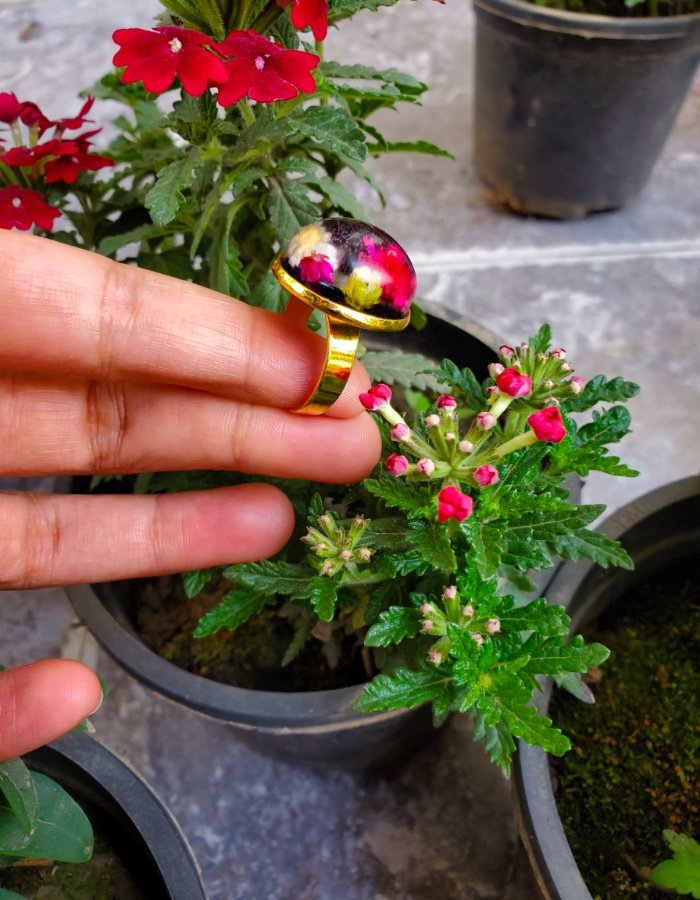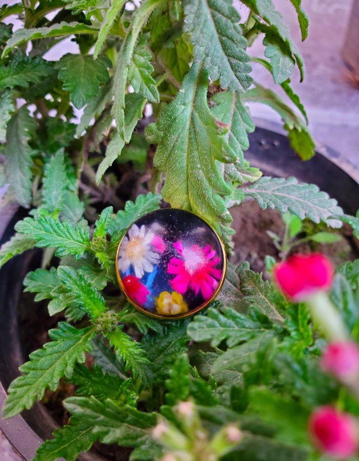 - Round resin ring with embedded dried flowers — a miniature bouquet sealed in glossy resin