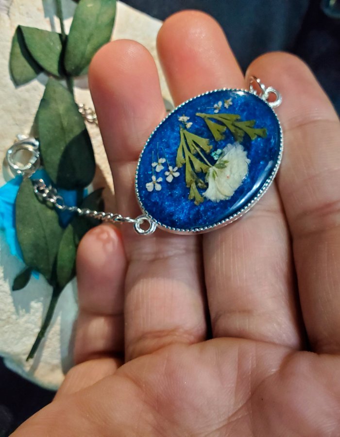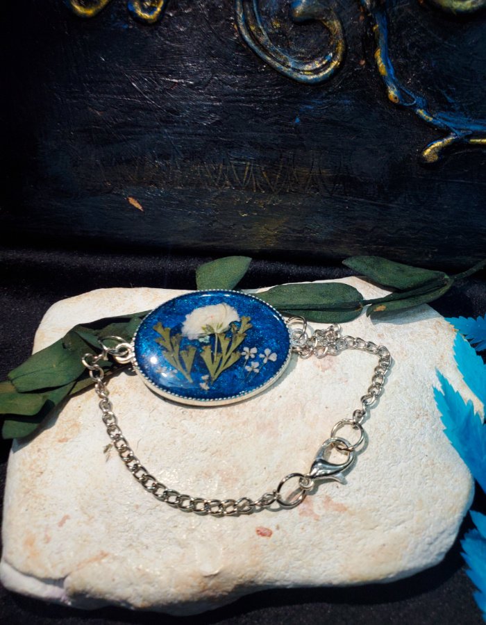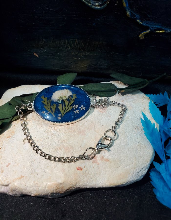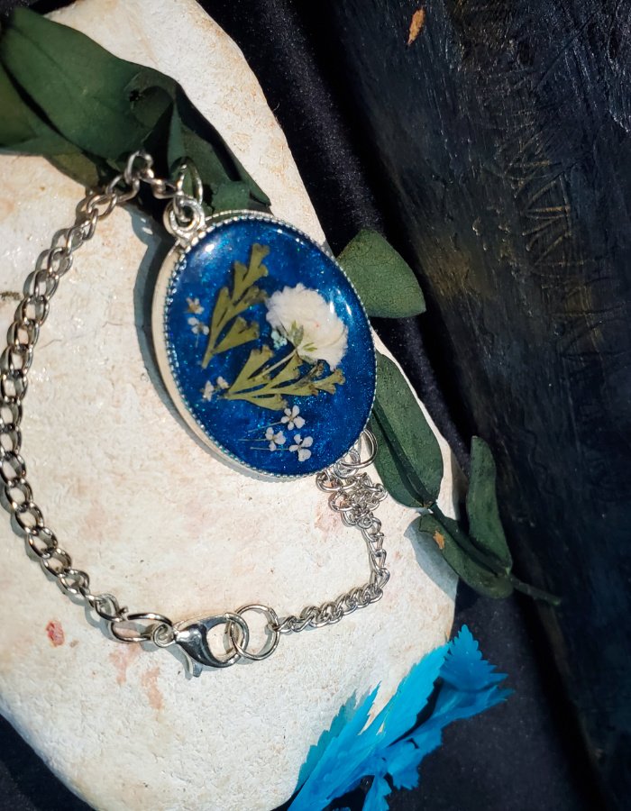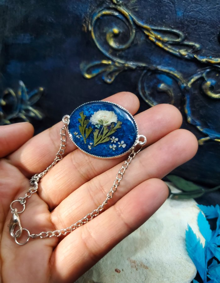 - Preserved white blossoms in deep-blue resin — glowing with purity, serenity, and grace.