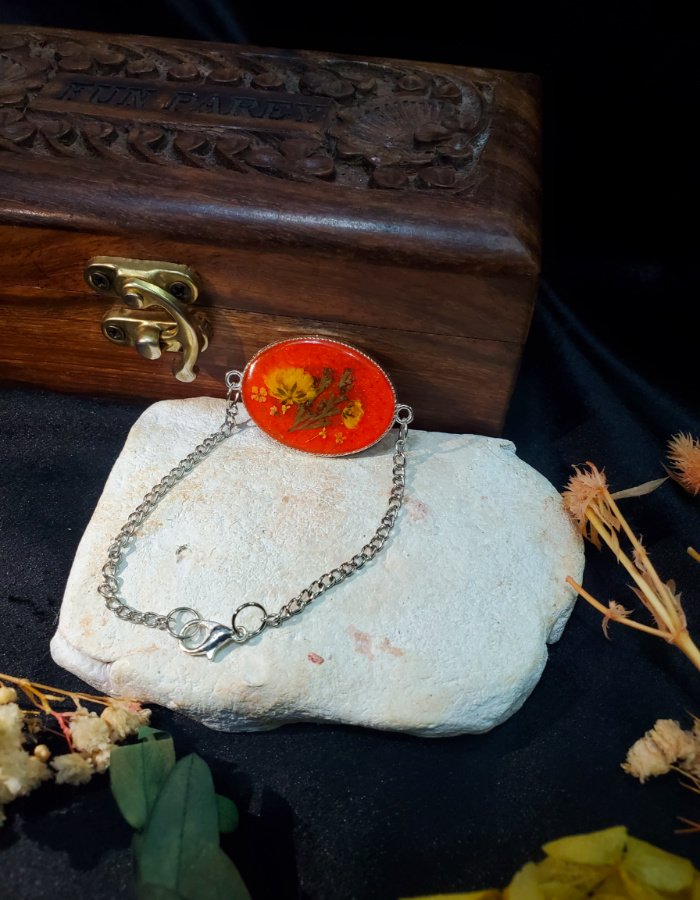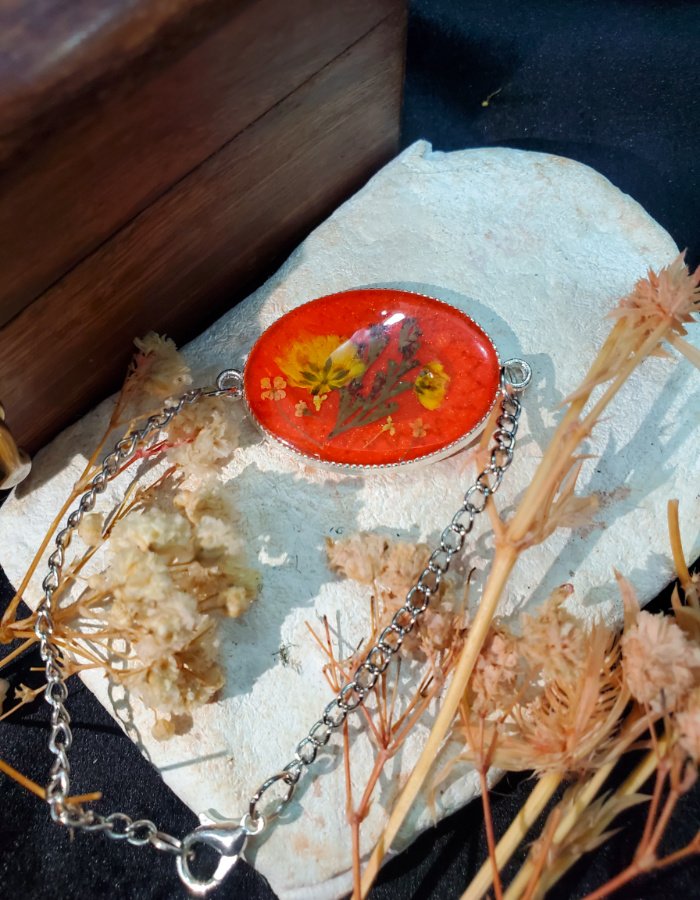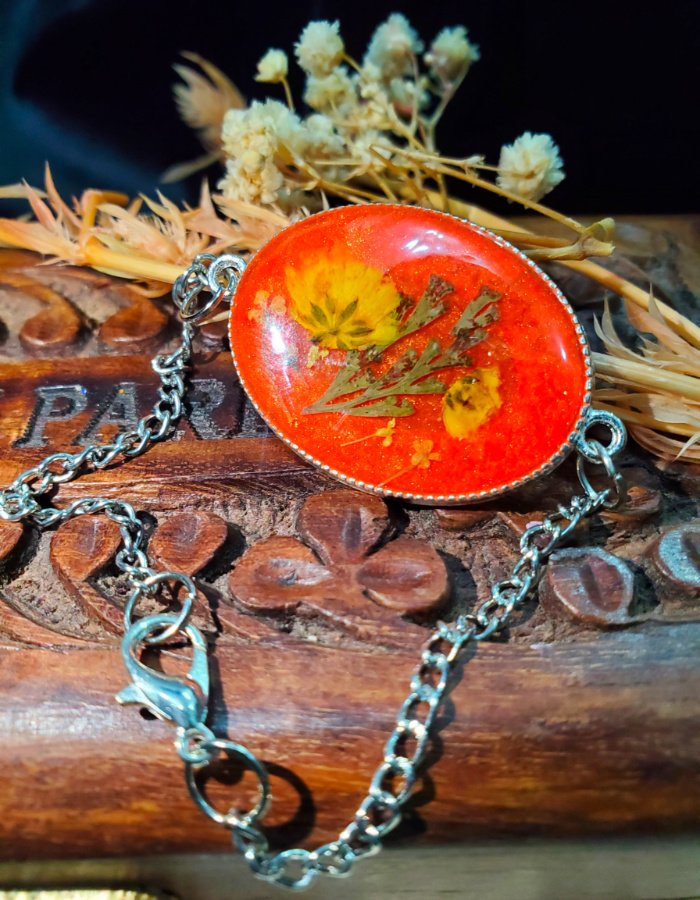 - Preserved yellow blossoms in red resin — glowing with warmth, vitality, and grace.