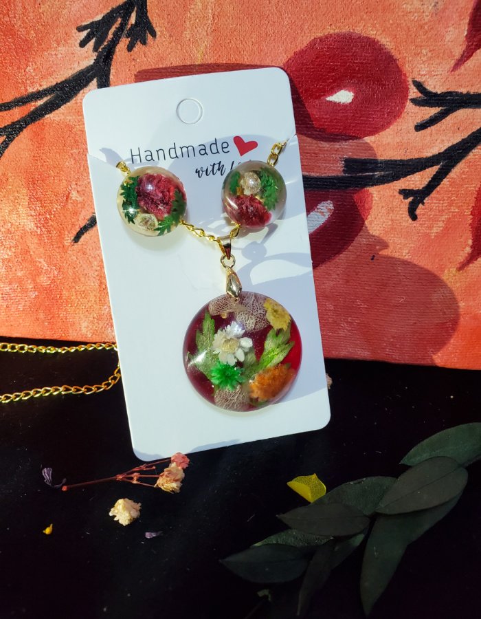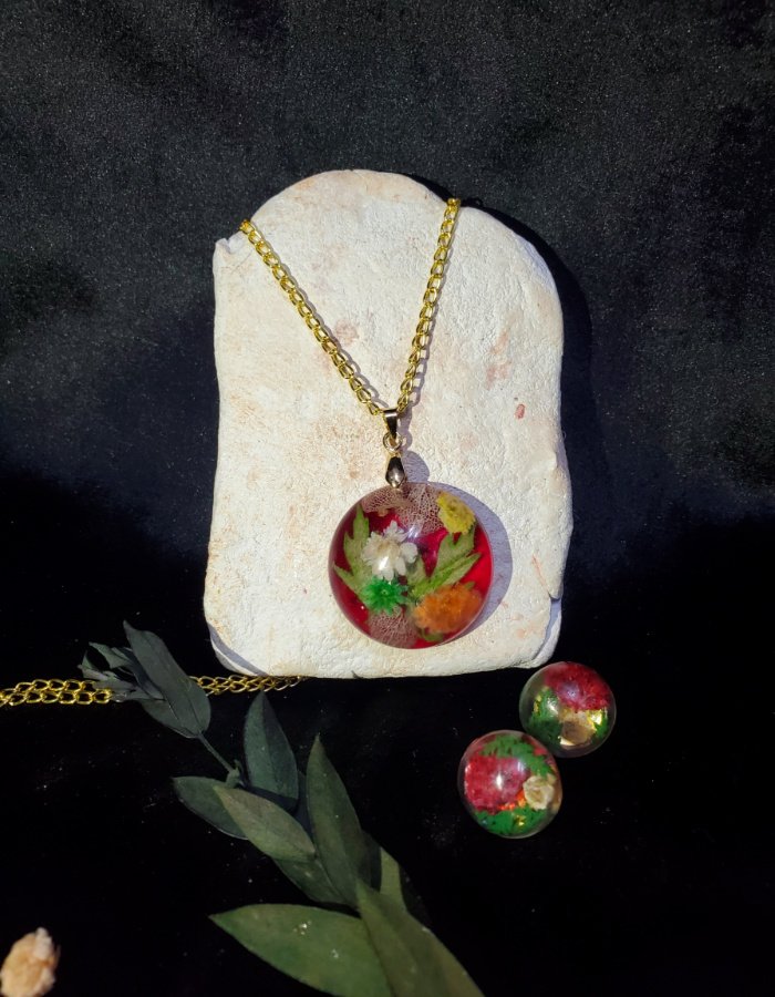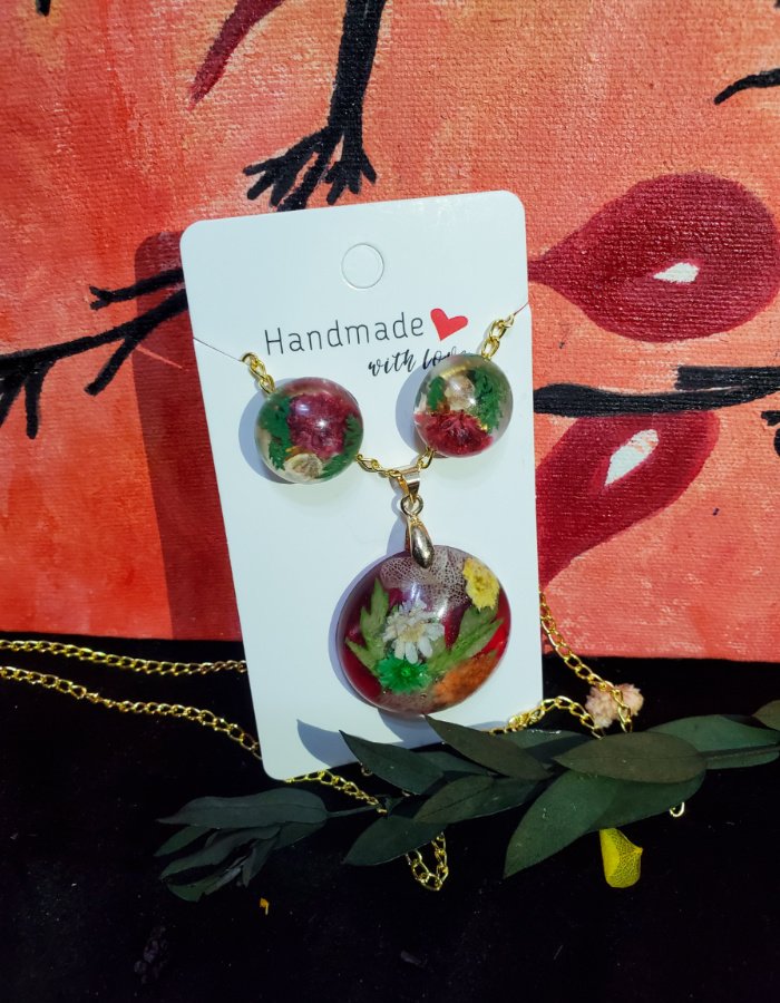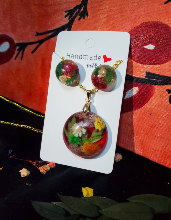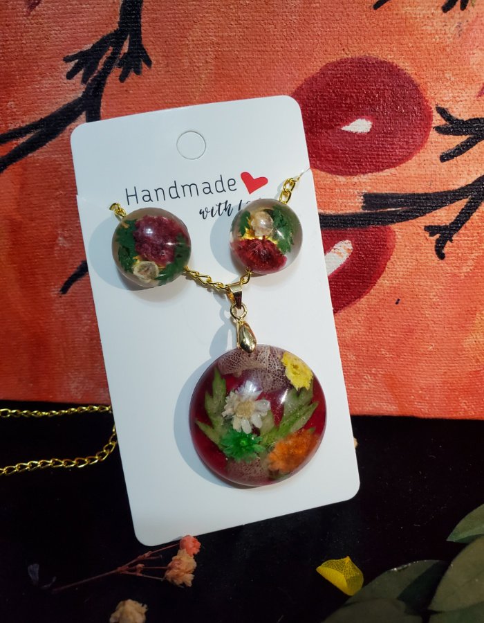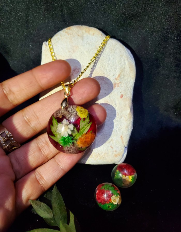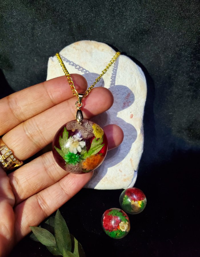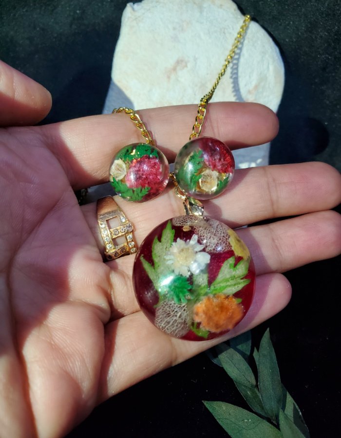 - Embedded dried flowers and leaves in clear resin — a vibrant bouquet preserved in luminous detail.