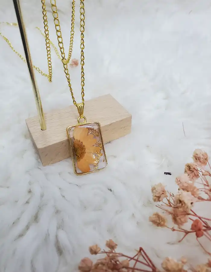 - Striking Visual Effect: The transparent resin highlights the flower and golden flakes, creating a captivating accessory.