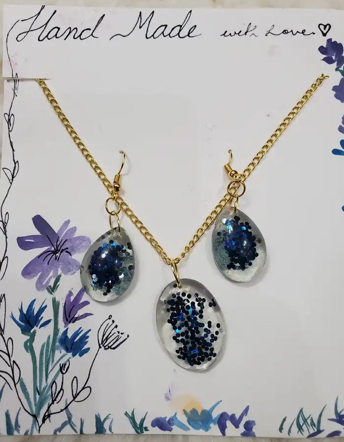 Resin Jewelry Set - Pendant & Earrings - Blue Glitter