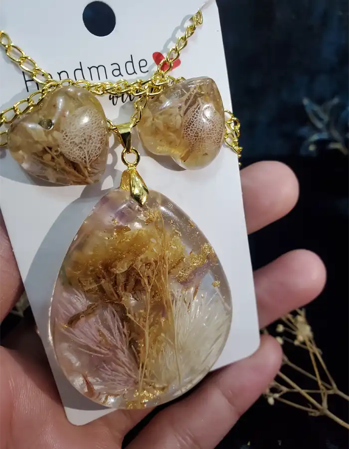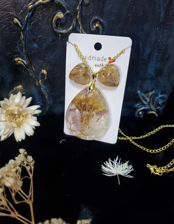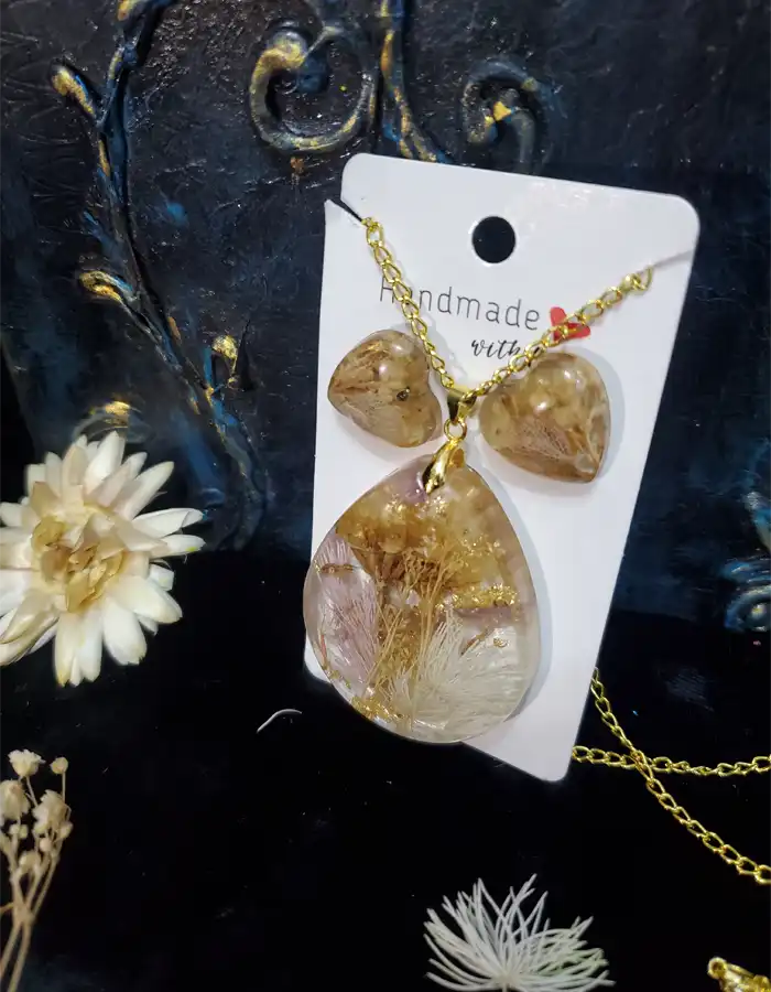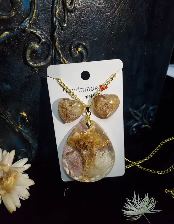 - Chic Set: Includes a large teardrop-shaped pendant and heart-shaped earrings, both without a frame.