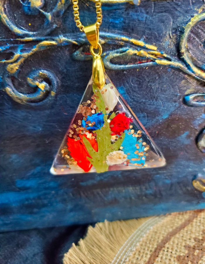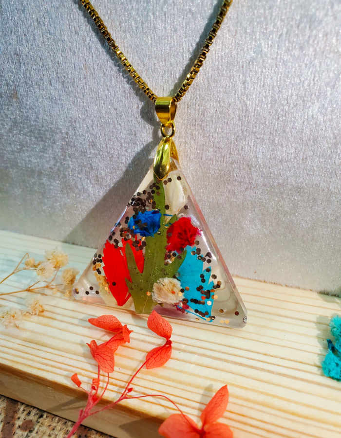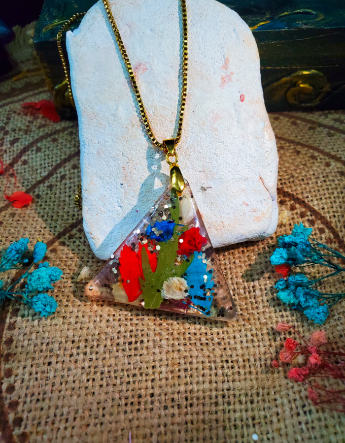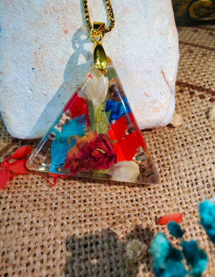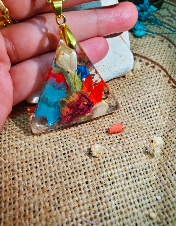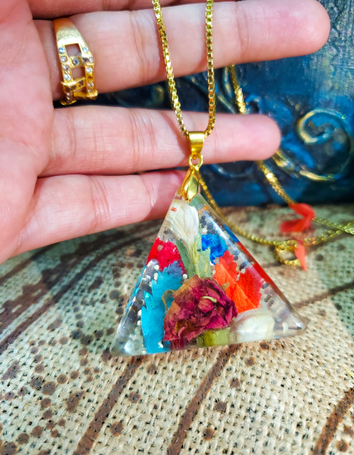 • Distinctive triangular silhouette — three graceful corners cradling vibrant dried flowers and golden flakes, symbolizing harmony, strength, and balance.