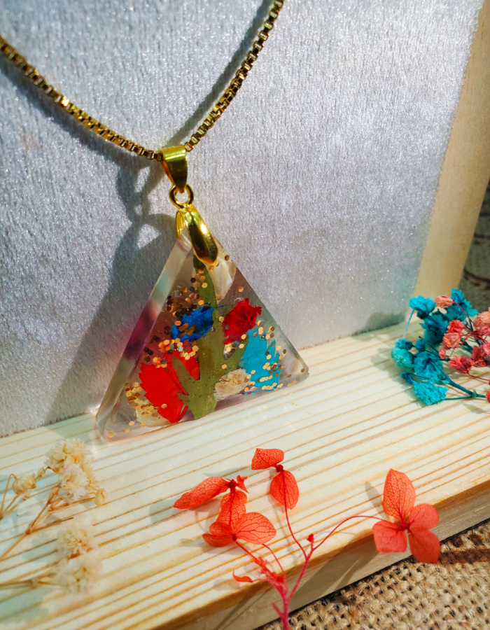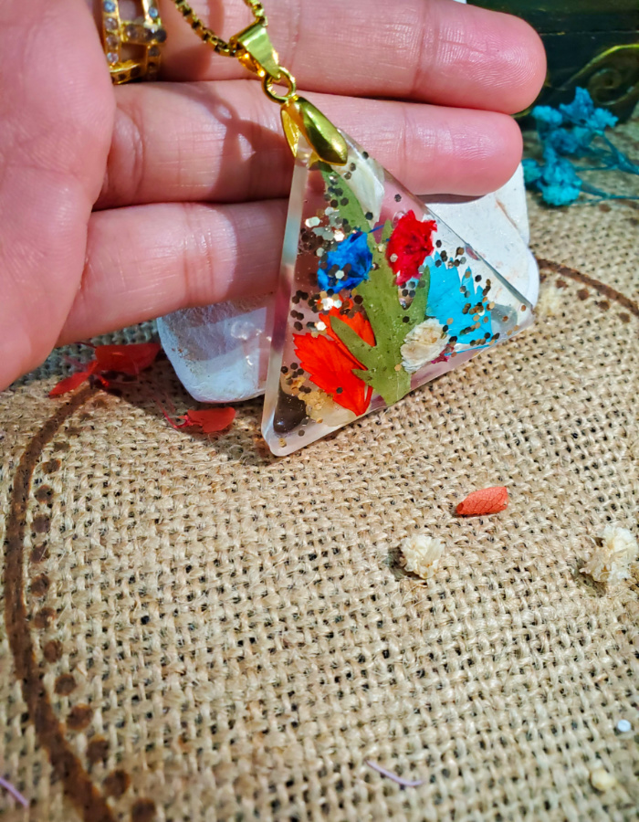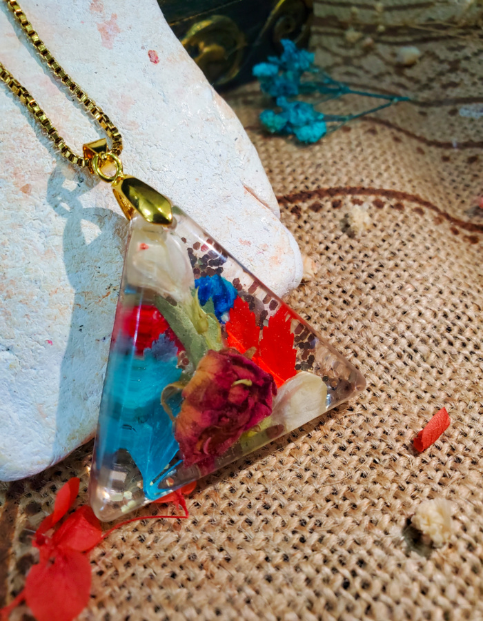 • A handcrafted celebration of geometry and bloom — resin pendant infused with preserved blossoms, framed in an antique-style base for timeless allure.