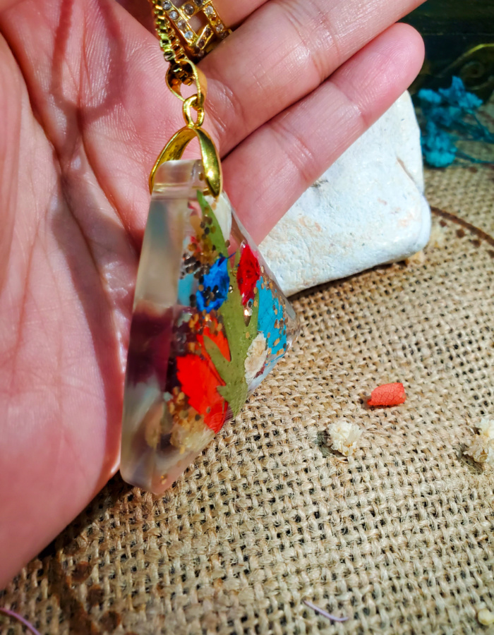 • Vibrant floral composition — hues of red, blue, green, and white shimmer within the resin, enlivened by delicate metallic accents.