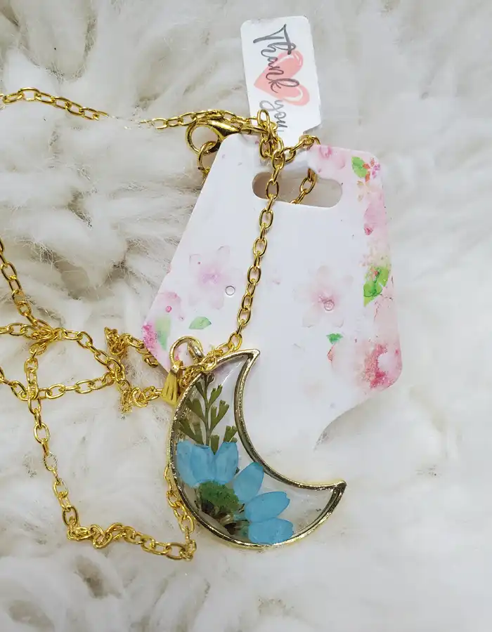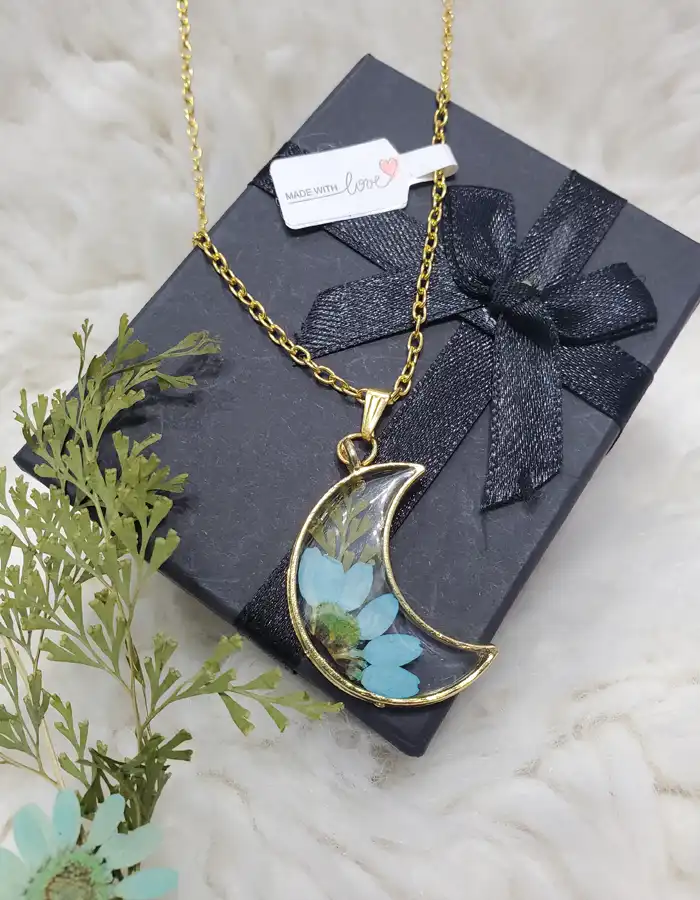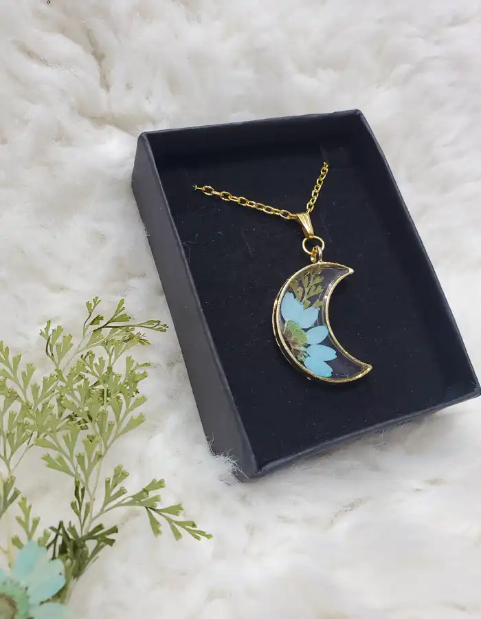 - Vibrant Cyan Flower: Adorned with a large half cyan pressed dried flower that brings a pop of color and natural beauty to the pendant.