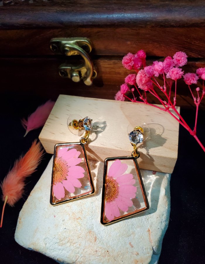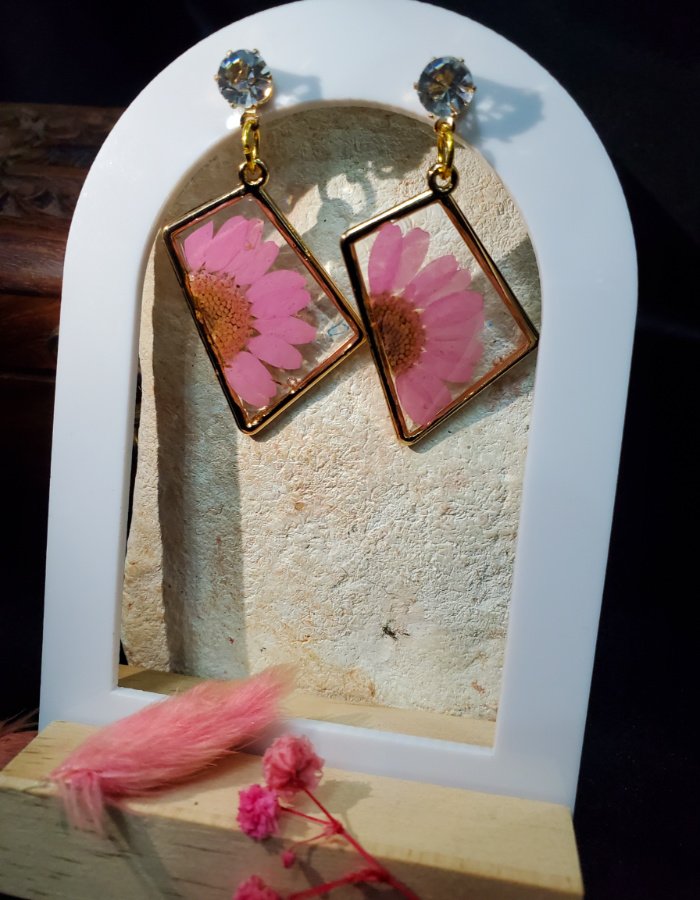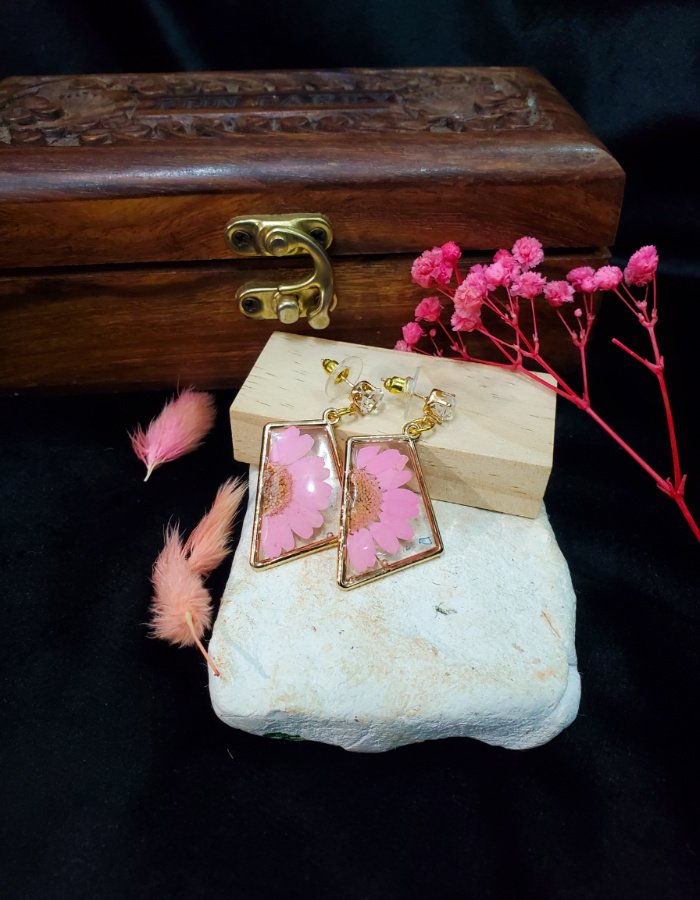 - Embedded pink blossoms with golden centers — tenderness and vitality preserved in resin.