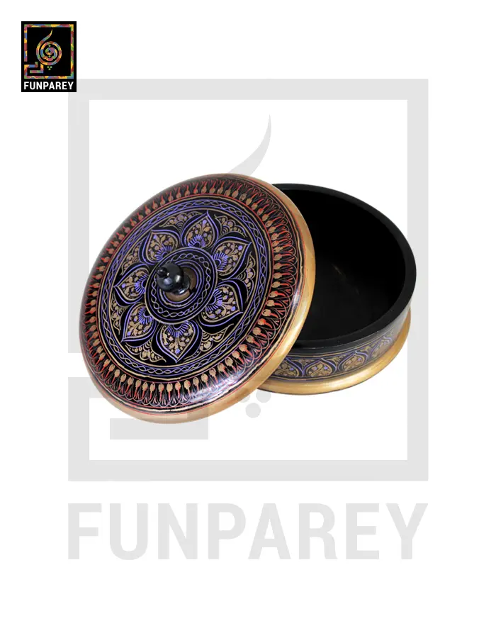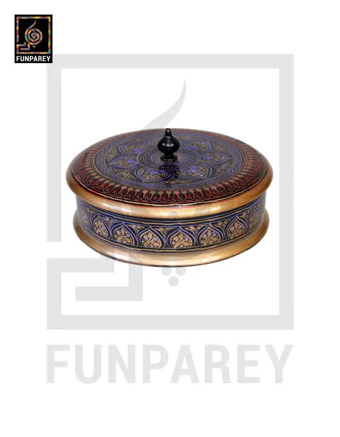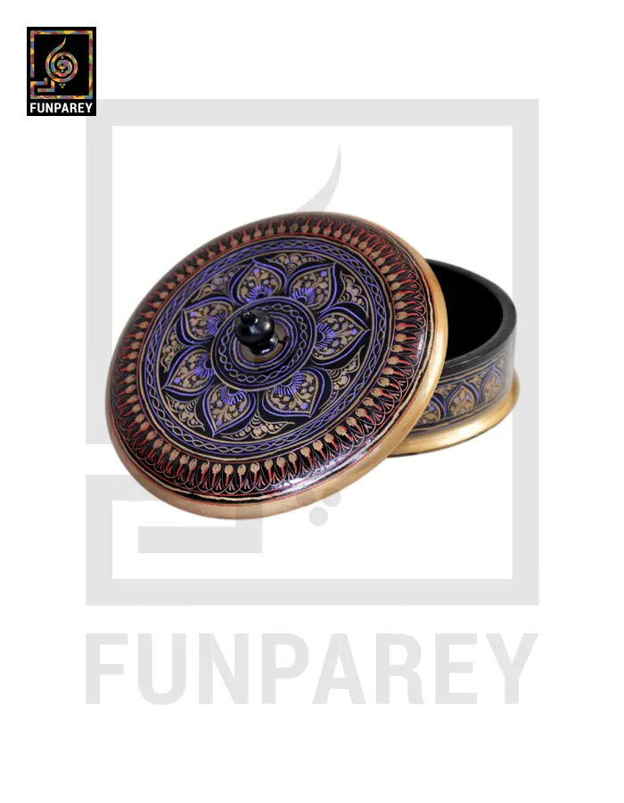 - Wooden Candy Bowl or Powder Box with Lacquer Art has a belly diameter of 6 Inches.