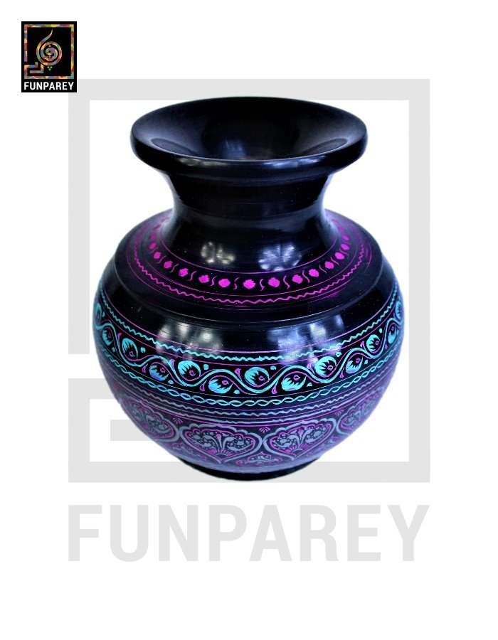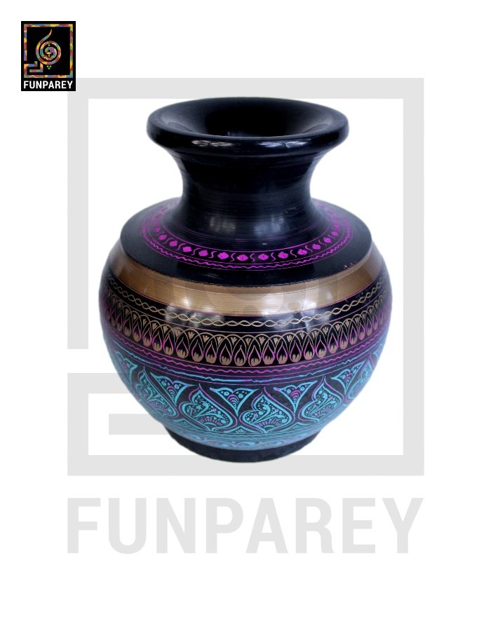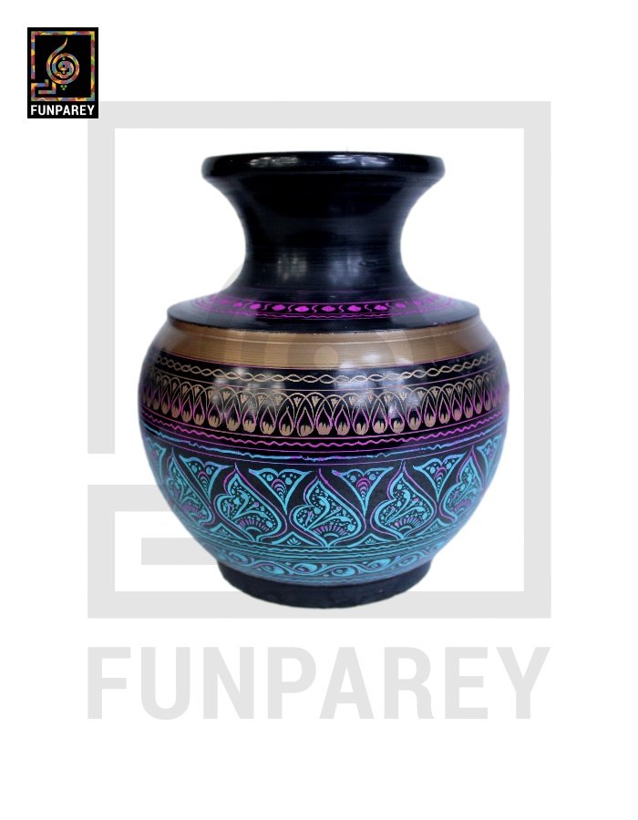 - Wooden Vessel with lacquer Art measures in the belly diameter of 7 Inches and a height of 7 Inches.