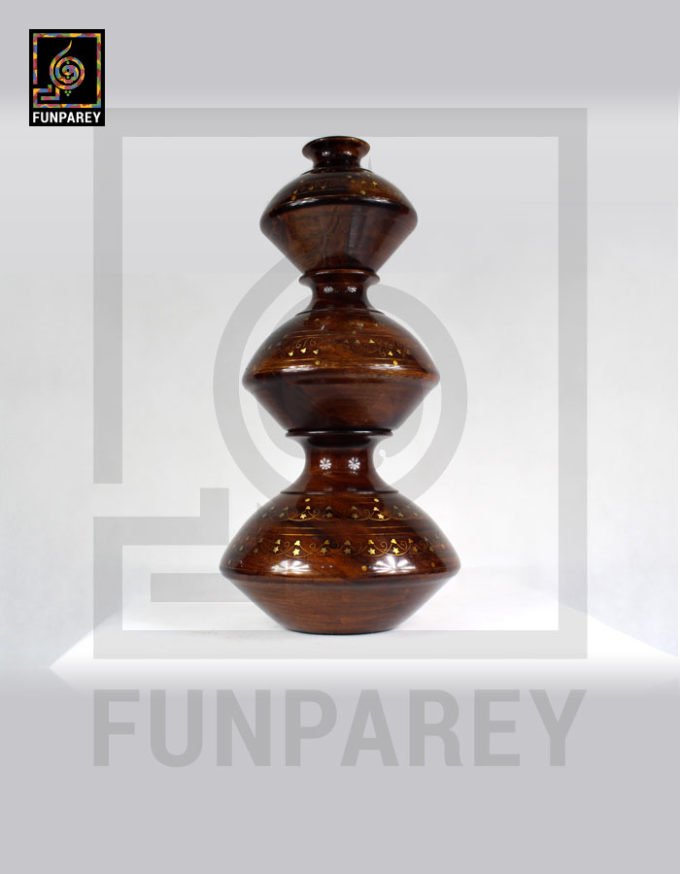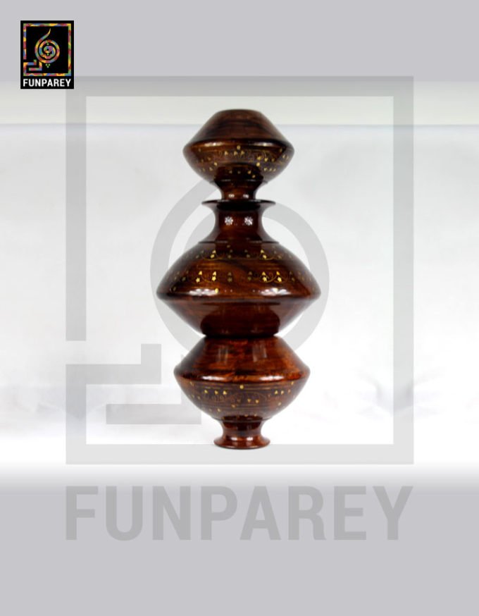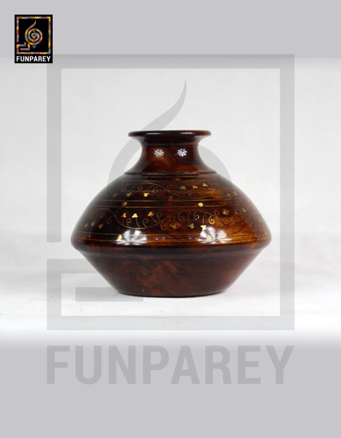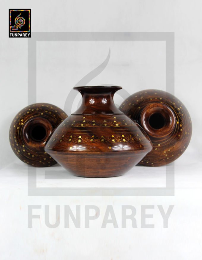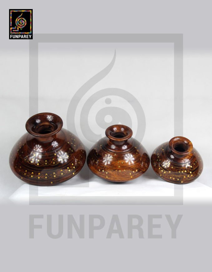 - Wooden Vessel Set with brass work has 3 total vessels in different sizes.