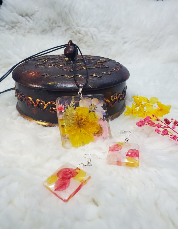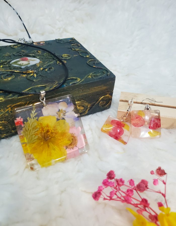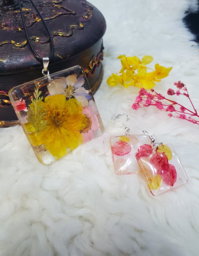 - Pressed Floral Design – Multicolor flowers sealed in glossy resin